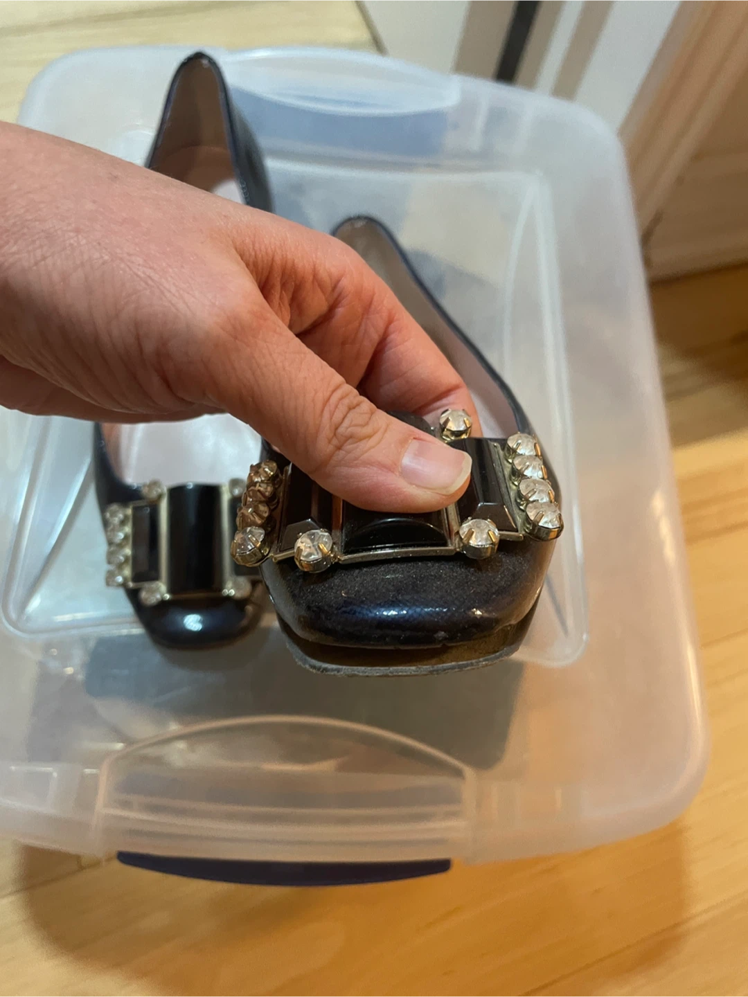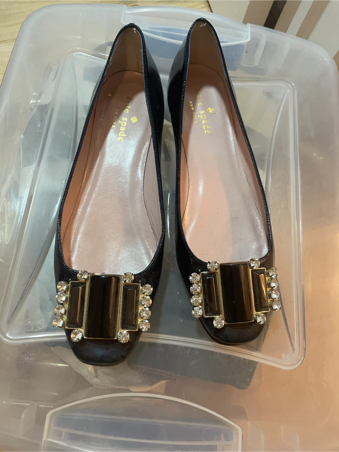 These Kate Spade ballet flats are black with a shiny patent finish. They feature a decorative buckle with rhinestones and dark rectangular stones on the toe. Low heel for comfort. Just needs to be glued on one of the shoe bottoms