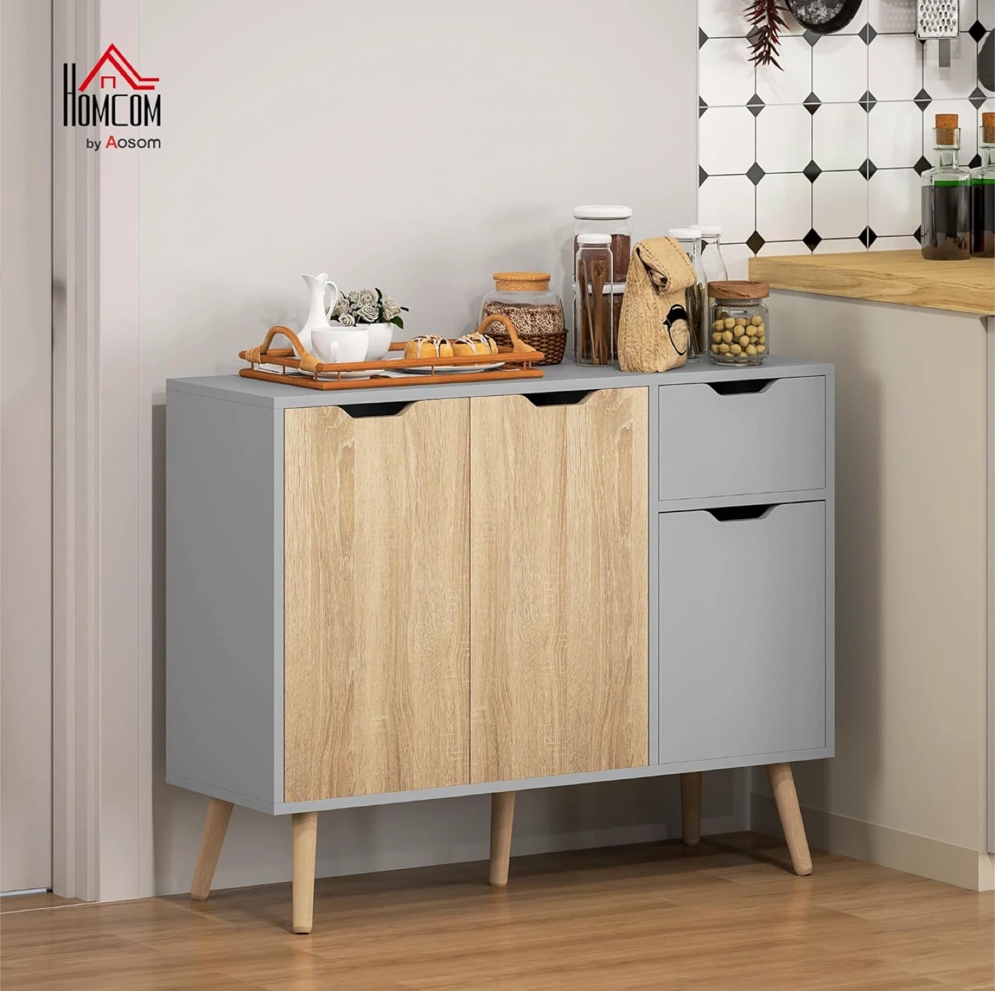 This grey and wood finishes cabinet from HOMCOM is perfect for adding storage and style to any room!