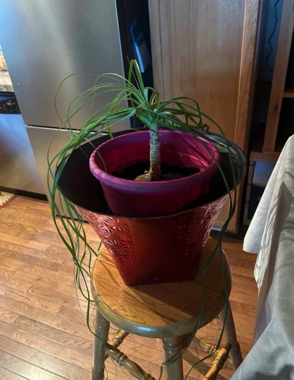 This is a ponytail palm plant in a pink pot. It's a lovely statement plant for any room! The plant itself has long, cascading green leaves that create a unique look.