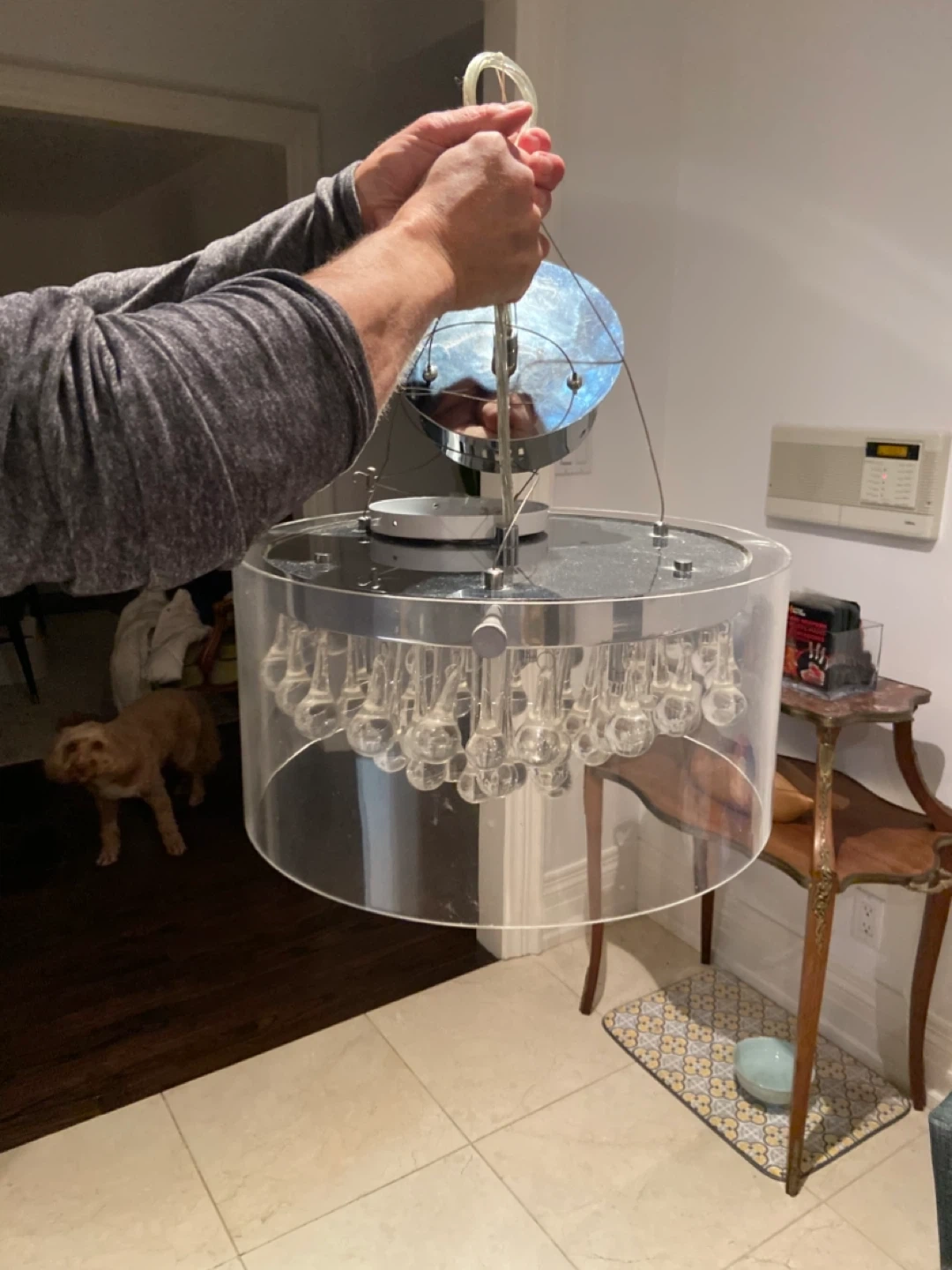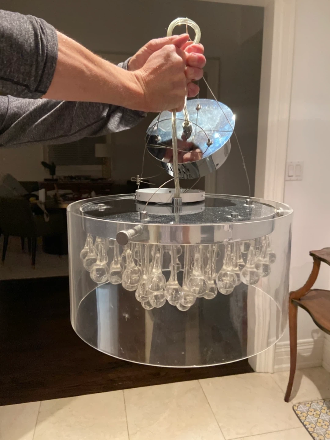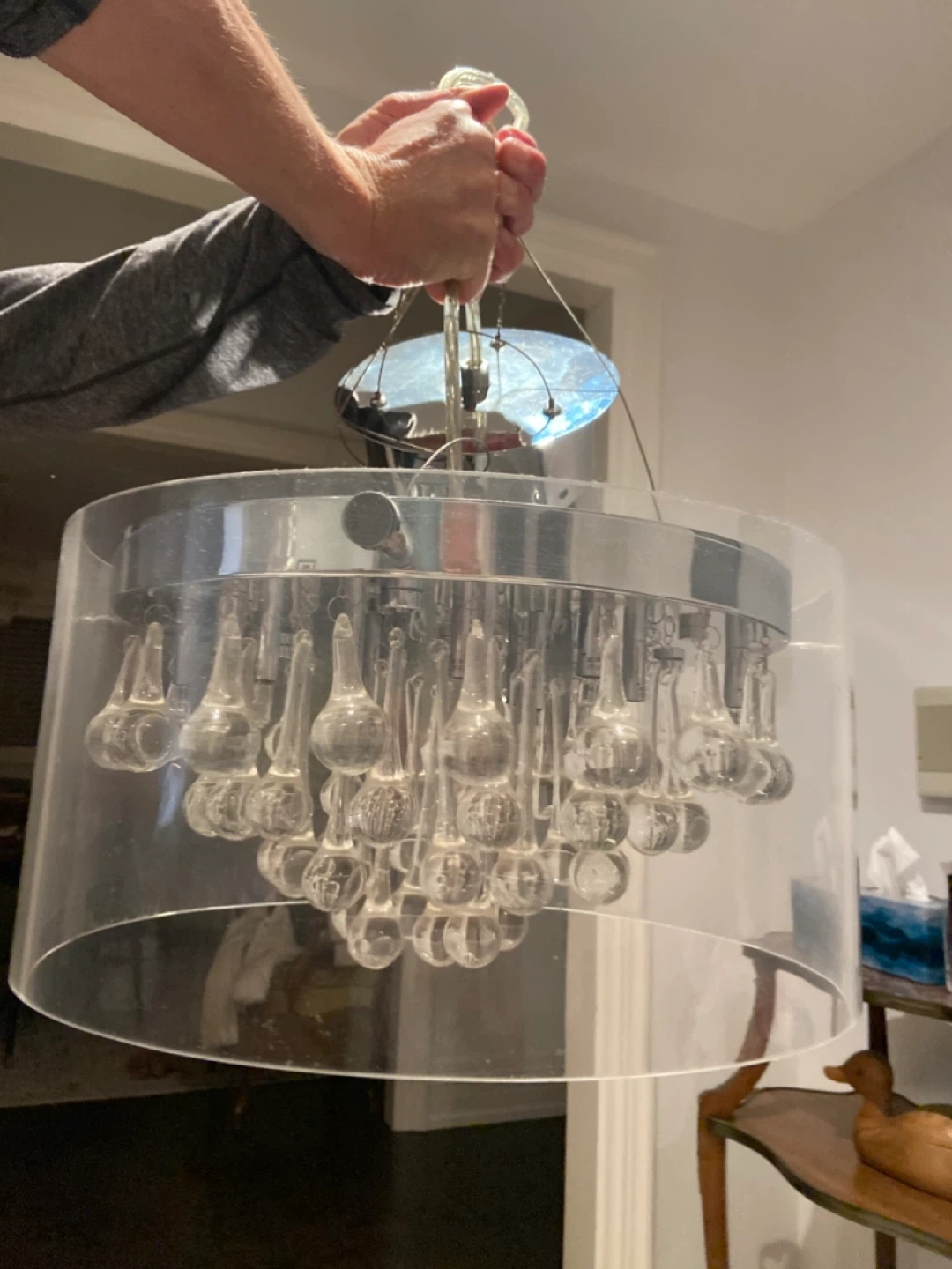 This decorative chandelier features a clear acrylic cylinder and numerous glass droplet accents. It's a stylish light fixture that adds sparkle to any room. Perfect for a dining area or entryway that needs a touch of elegance!