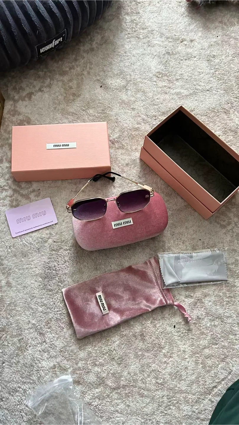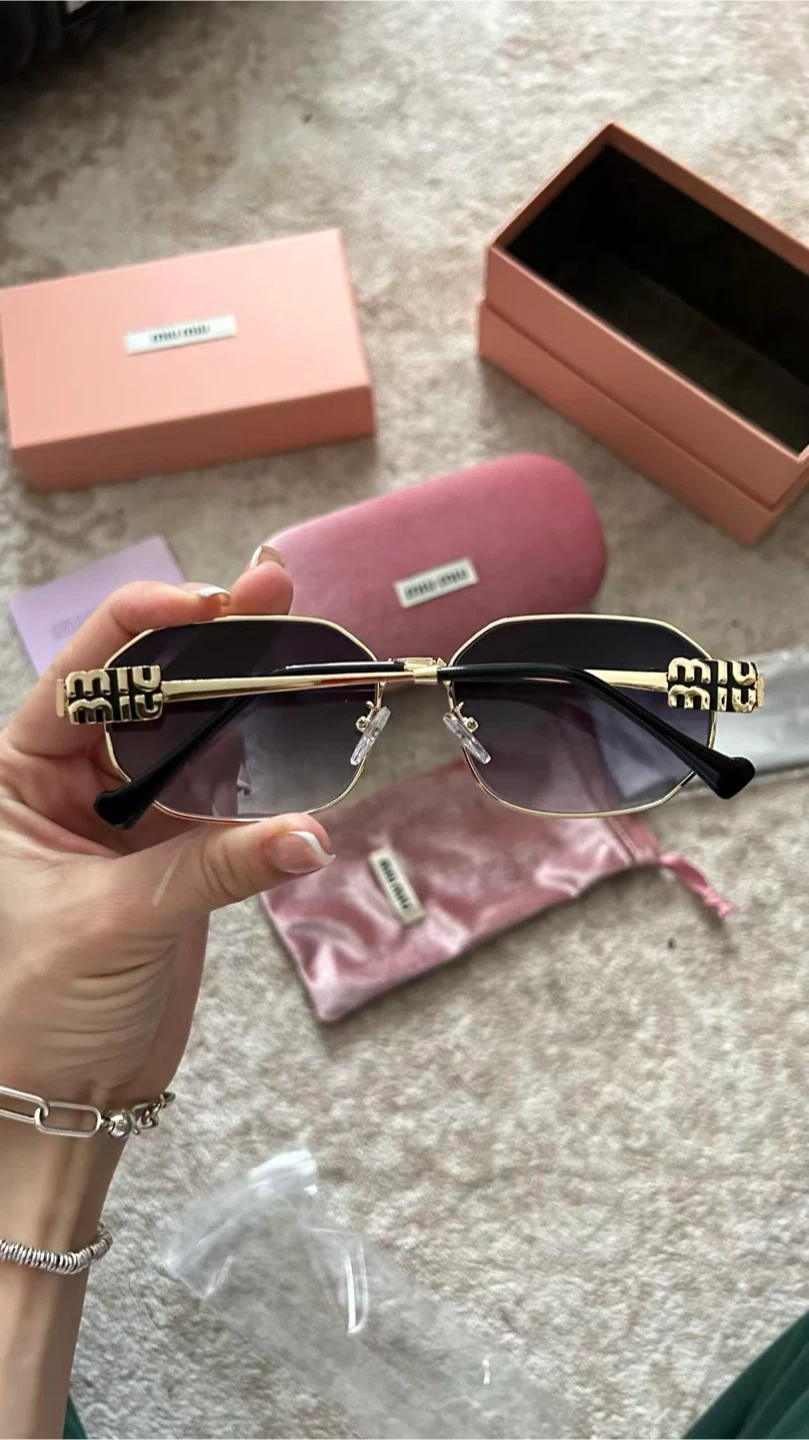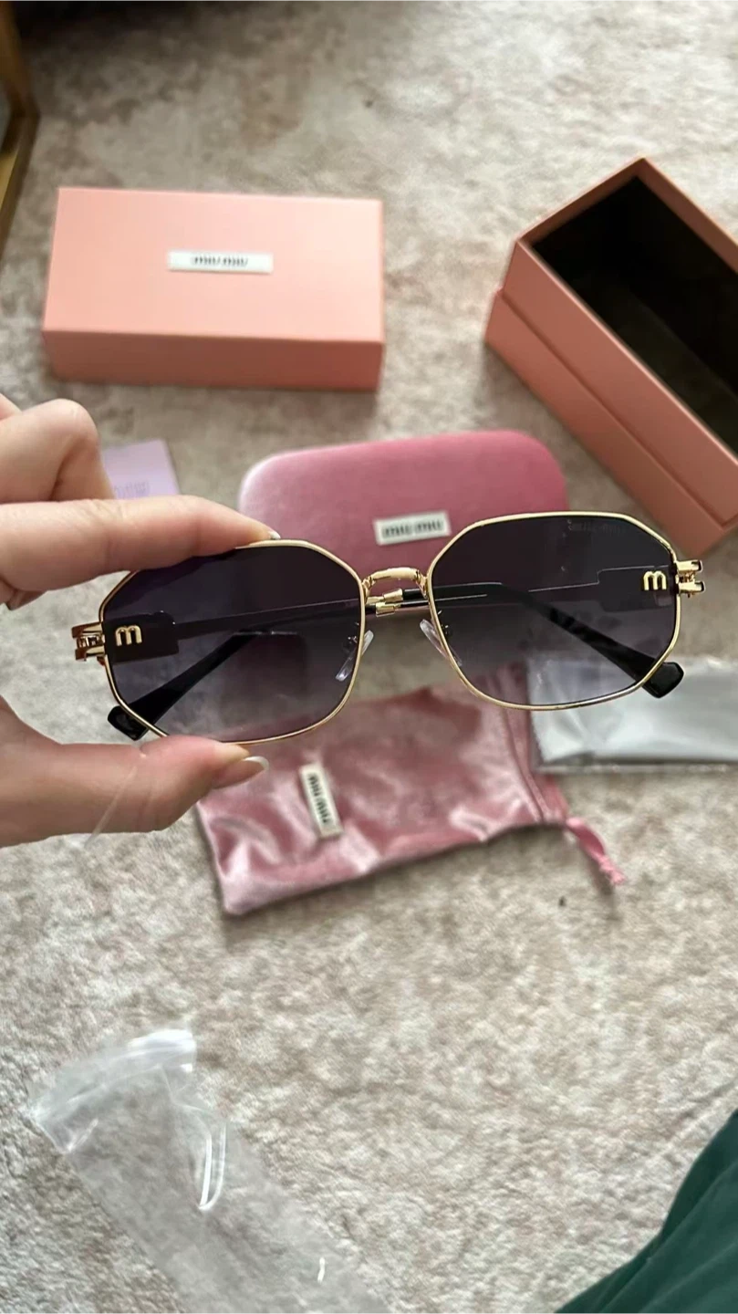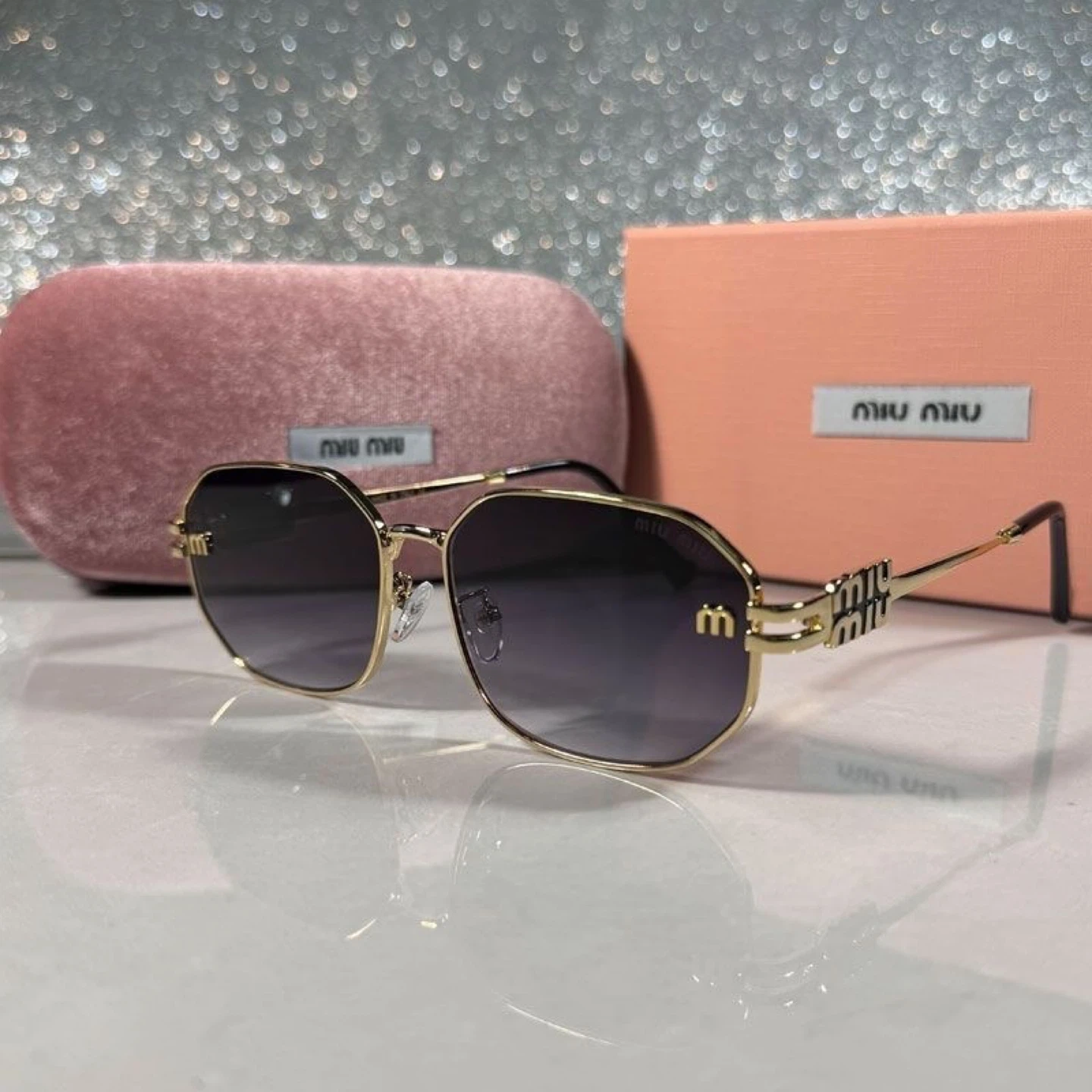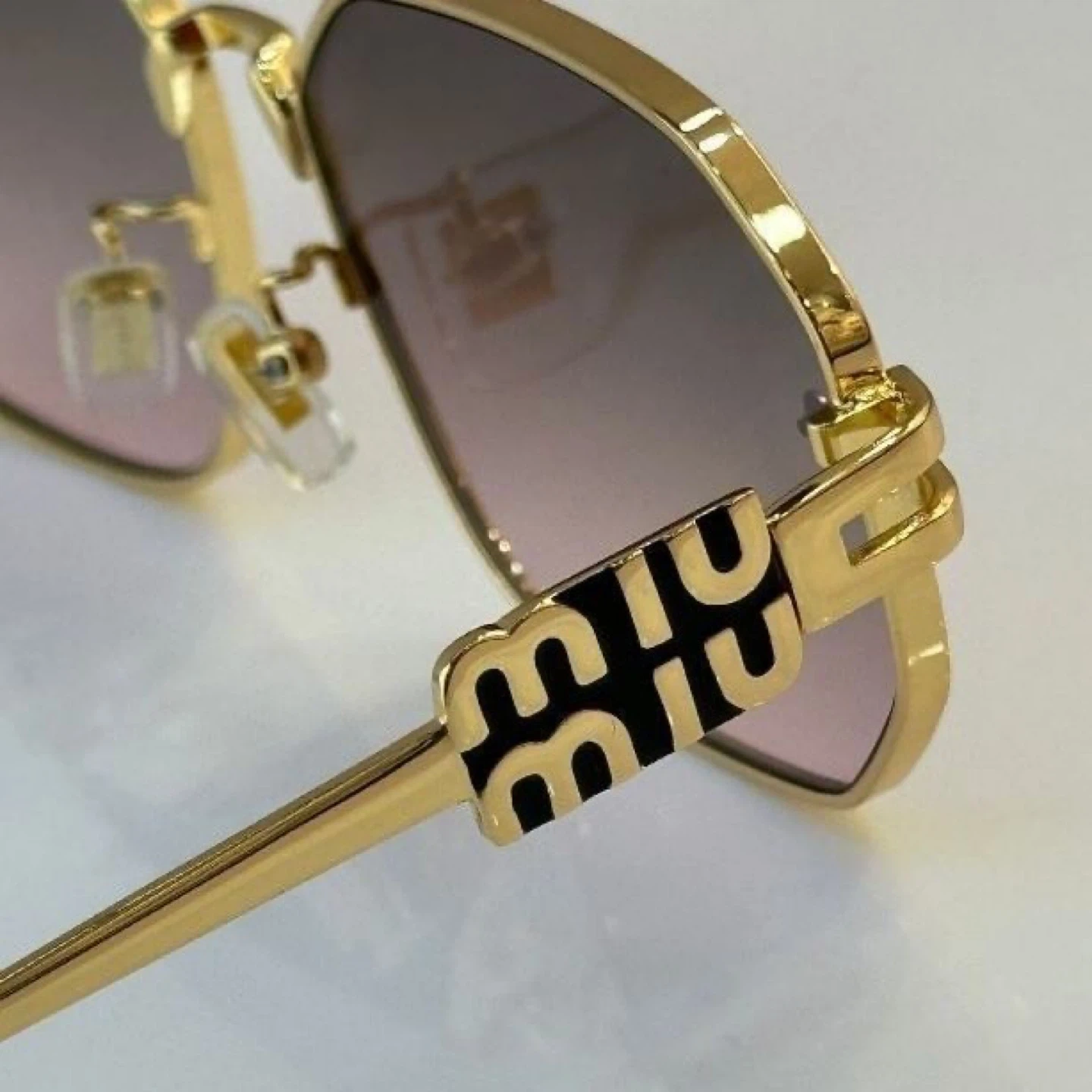 These Miu Miu sunglasses feature a gold-tone metal frame with gradient lenses. They come complete with the original box, case, and pouch. The detailed Miu Miu logo is visible on the temples.