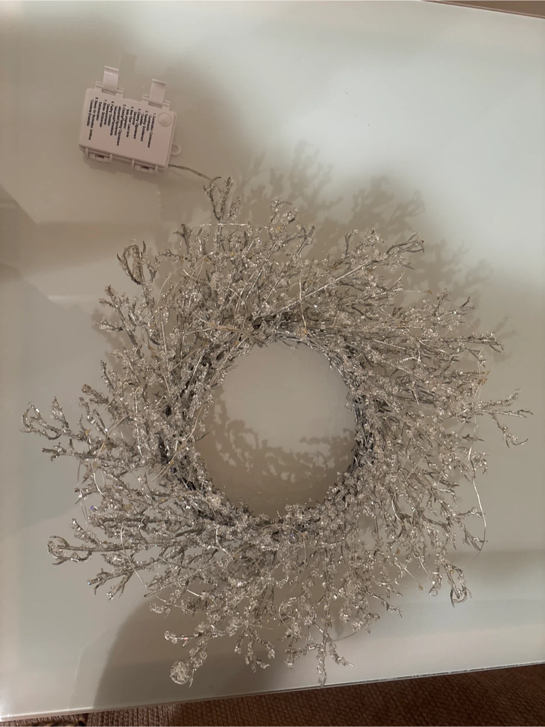 Selling a beautiful silver decorative wreath, perfect for adding a touch of sparkle to your home. It comes with attached lights to create a warm and inviting ambiance. Great for the holidays or any time of year!