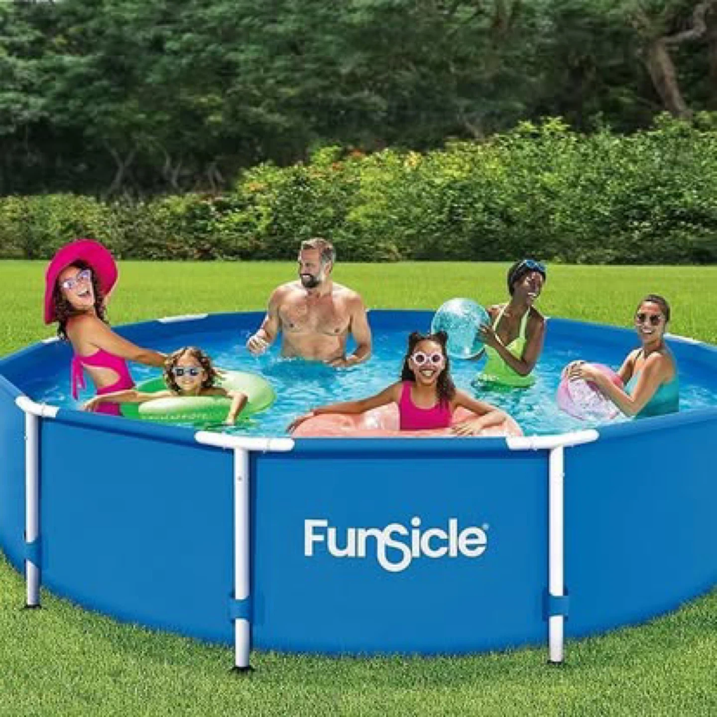 This 12ft Funsicle Activity Pool Set includes a strong and sturdy metal frame with easy setup lock pins. It features a durable, puncture-resistant liner made of 3-layered polyester mesh between heavy gauge PVC materials. The set comes with an exclusive 2-in-1 side-mounted SkimmerPlus filter pump that combines skimmer and pump functions. It's perfect for a backyard summer oasis!