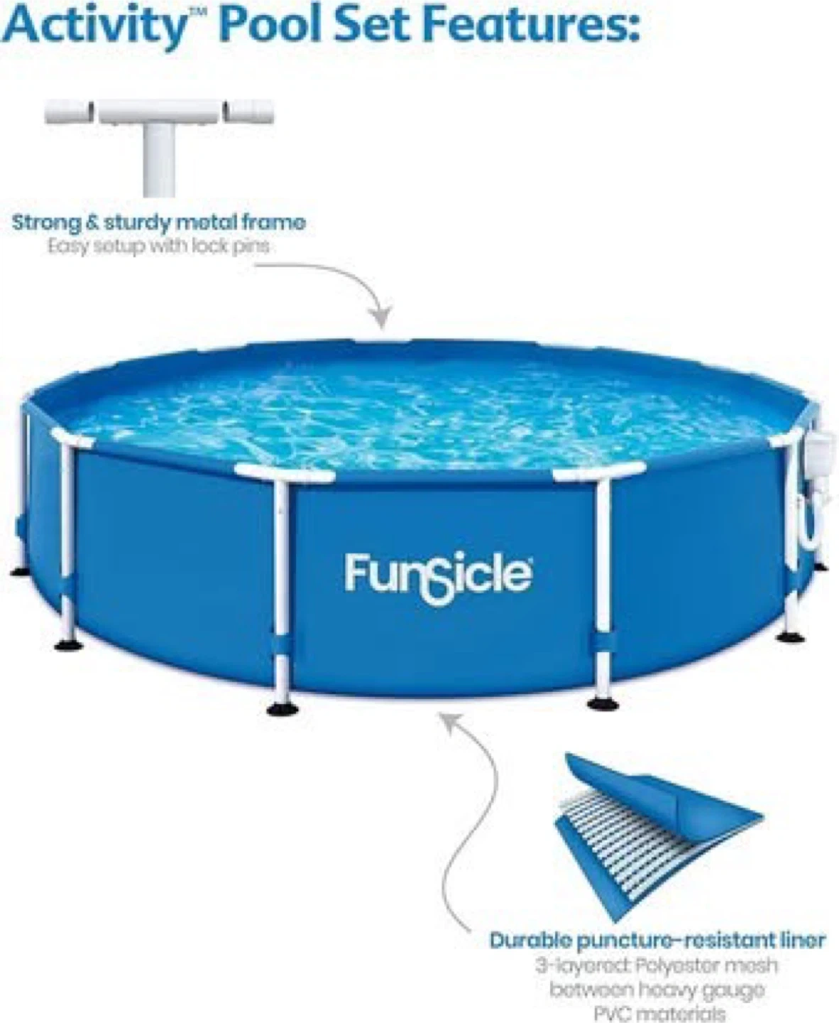 This 12ft Funsicle Activity Pool Set includes a strong and sturdy metal frame with easy setup lock pins. It features a durable, puncture-resistant liner made of 3-layered polyester mesh between heavy gauge PVC materials. The set comes with an exclusive 2-in-1 side-mounted SkimmerPlus filter pump that combines skimmer and pump functions. It's perfect for a backyard summer oasis!