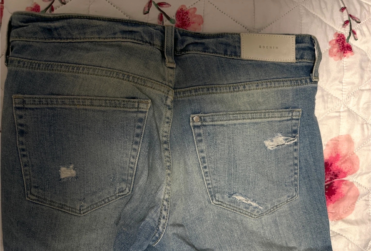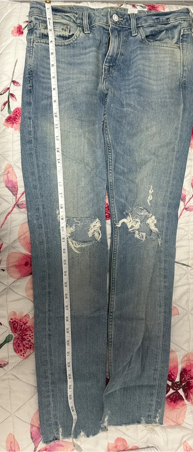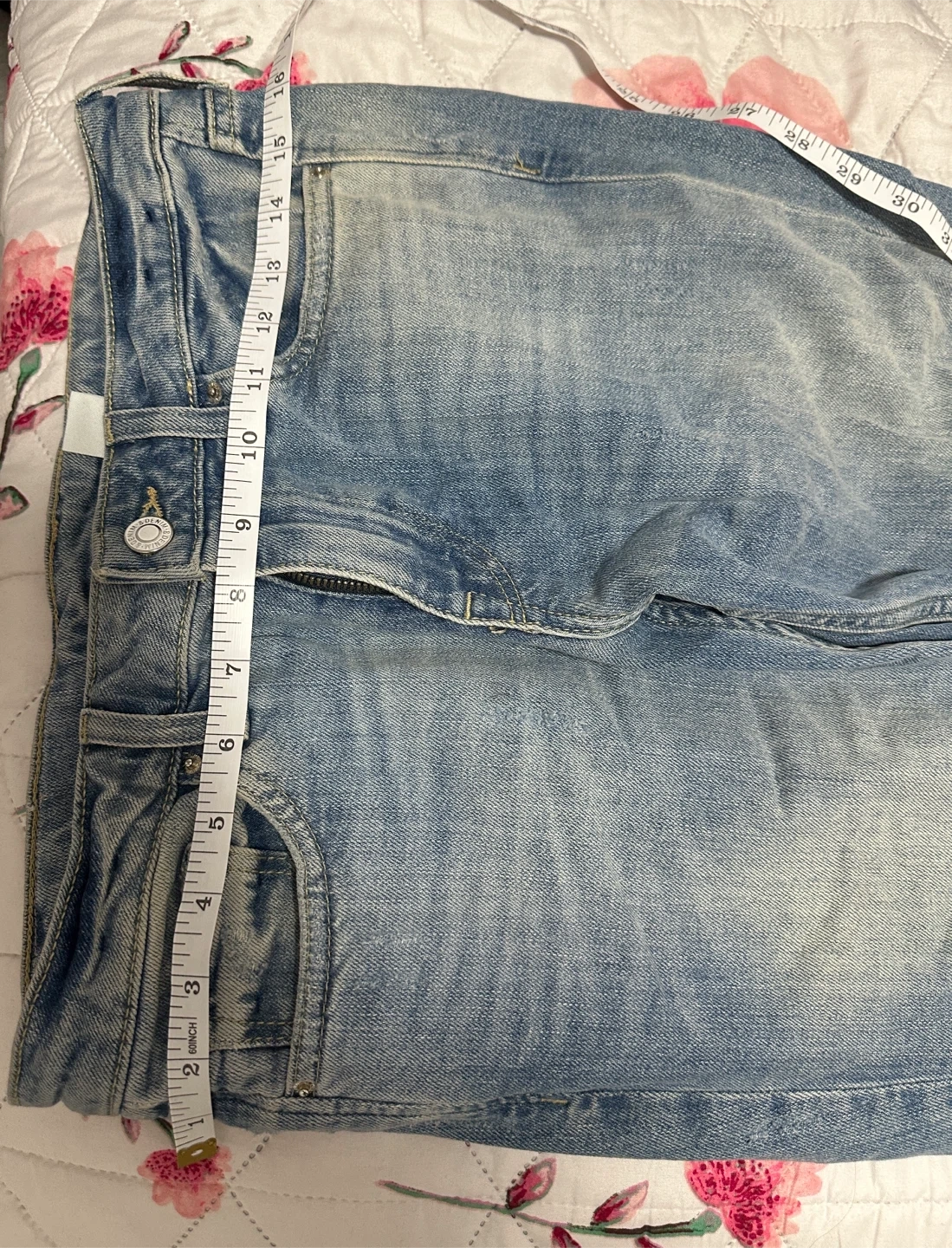 Perfect for casual wear! Stylish & Denim jeans. Light wash with cool distressed details, like ripped knees and frayed hems. Waist measures around 31 inches, inseam is about 27 inches.