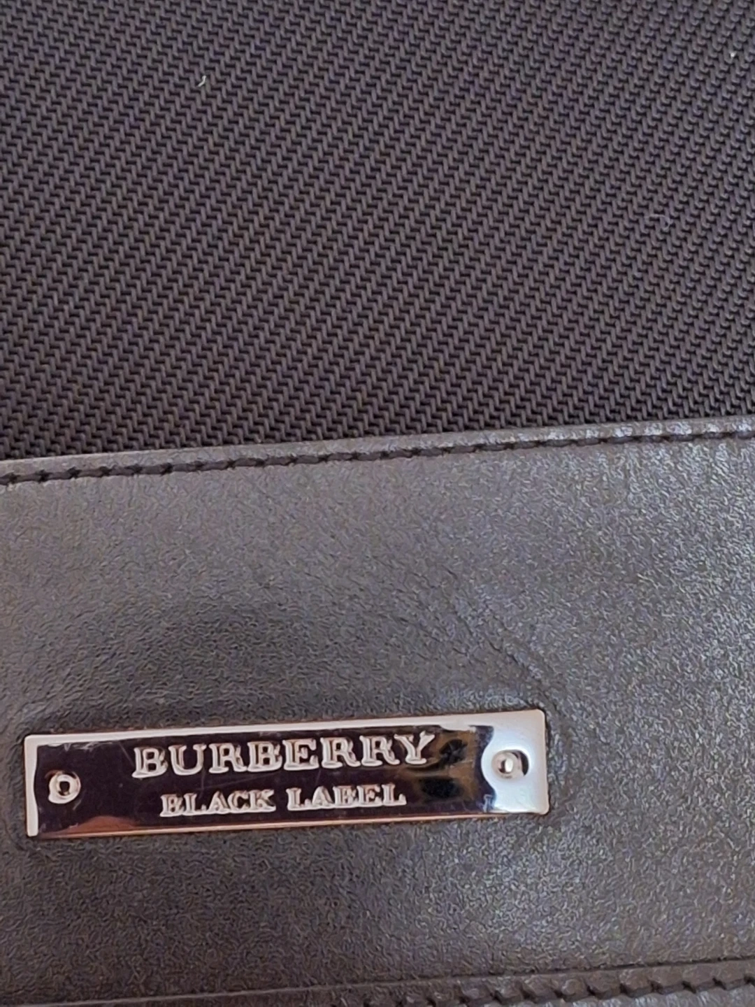 This is a Burberry Black Label messenger bag. It's black and features a fabric and leather construction with buckle closures. The interior is lined with fabric.