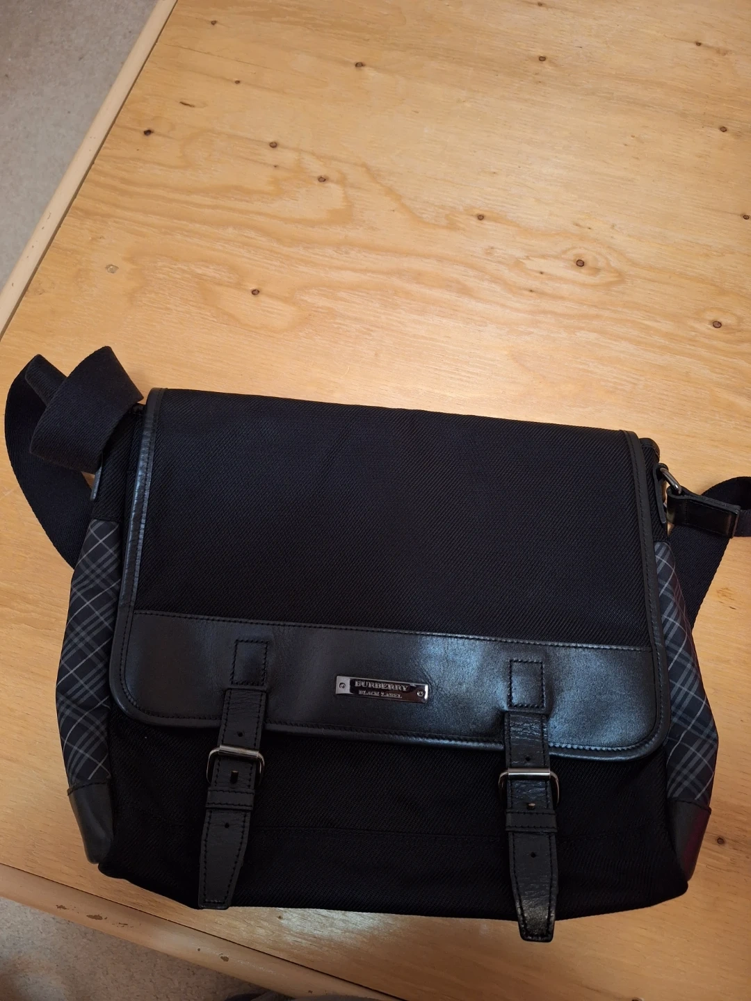 This is a Burberry Black Label messenger bag. It's black and features a fabric and leather construction with buckle closures. The interior is lined with fabric.