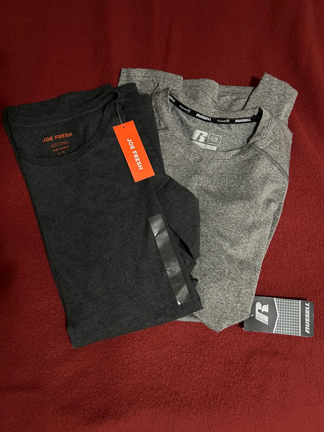 Selling two t-shirts in great condition! One is a Joe Fresh short-sleeved tee, and the other is a Russell Athletic short-sleeved tee. Both are size large and perfect for casual wear or working out! The material is soft and breathable, making them super comfy for everyday use. Brand new with tags attached.