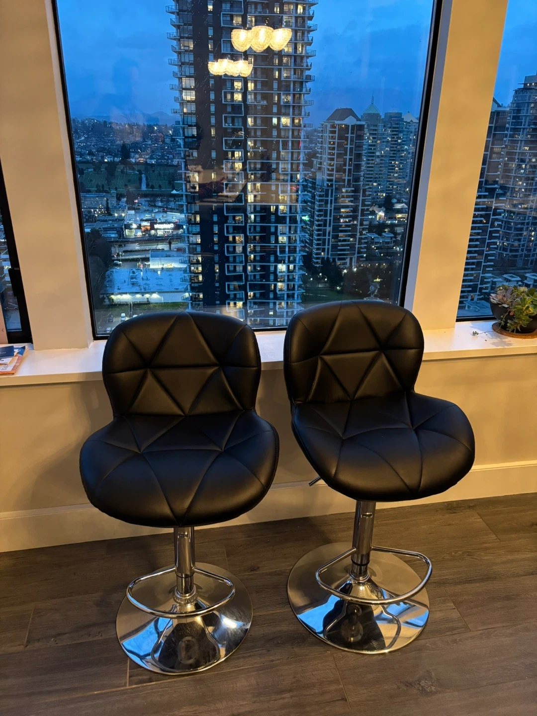 Two Cierra Swivel Adjustable Height Bar Stools by Mercer41. Black upholstery. These stools' height is adjustable. They're built with a metal base for stability.