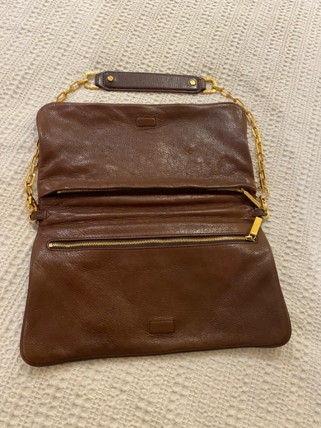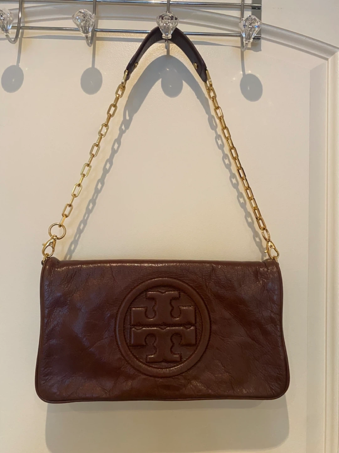 Selling a Tory Burch shoulder bag in brown leather. It features a gold chain strap and the brand's iconic logo on the front. It's in great condition and perfect for adding a touch of luxury to your outfit