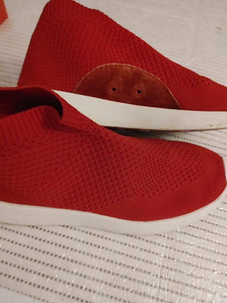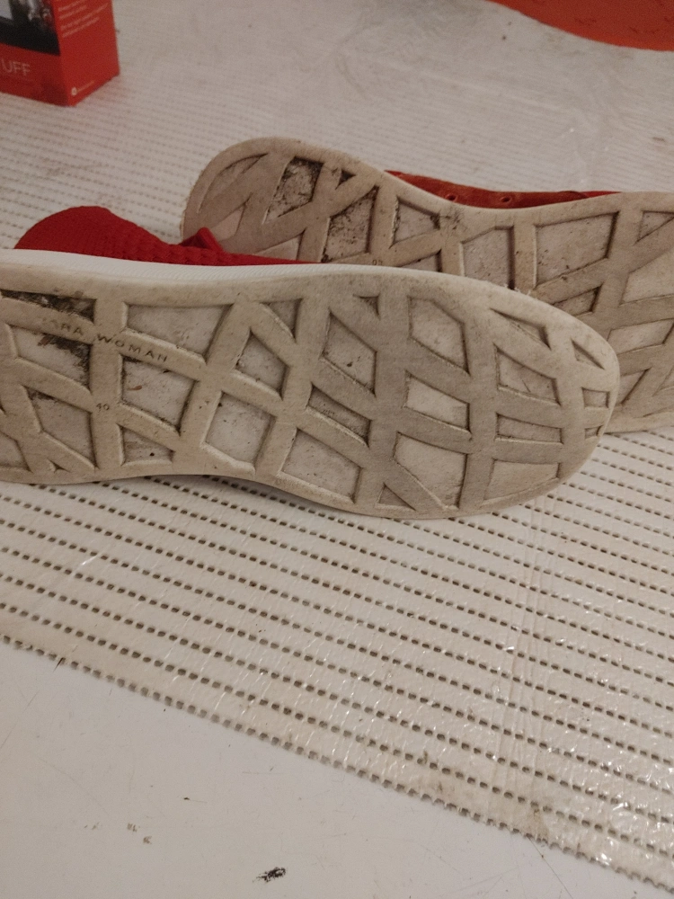 Selling a pair of Zara Woman red knit sneakers. The size is EU 40, which is approximately a US size 10. They have a unique sock-like fit and a comfortable white sole. Perfect for casual wear!