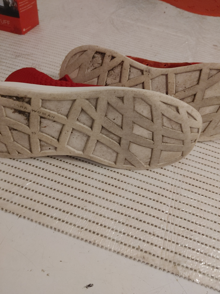 Selling a pair of Zara Woman red knit sneakers. The size is EU 40, which is approximately a US size 10. They have a unique sock-like fit and a comfortable white sole. Perfect for casual wear!