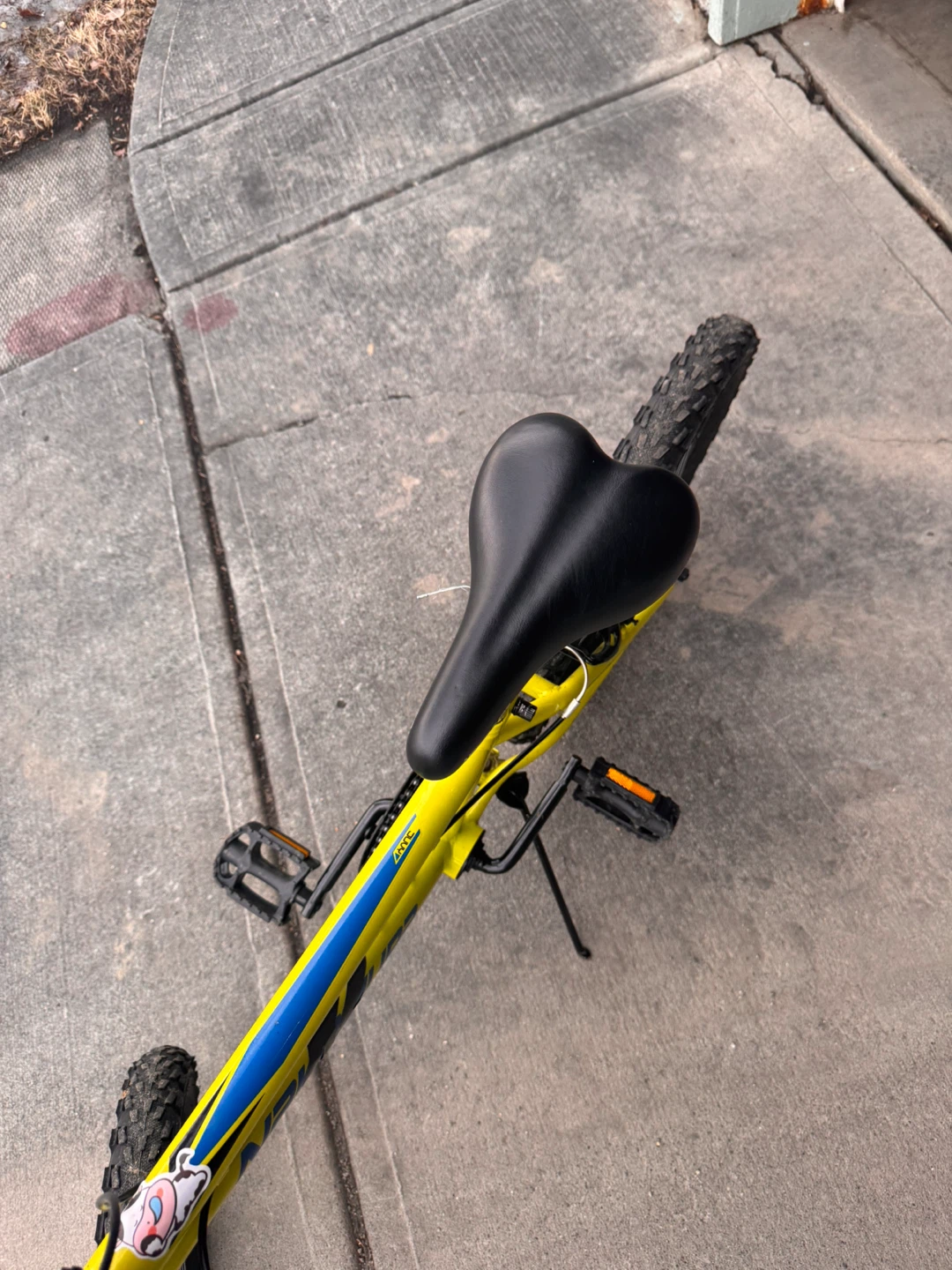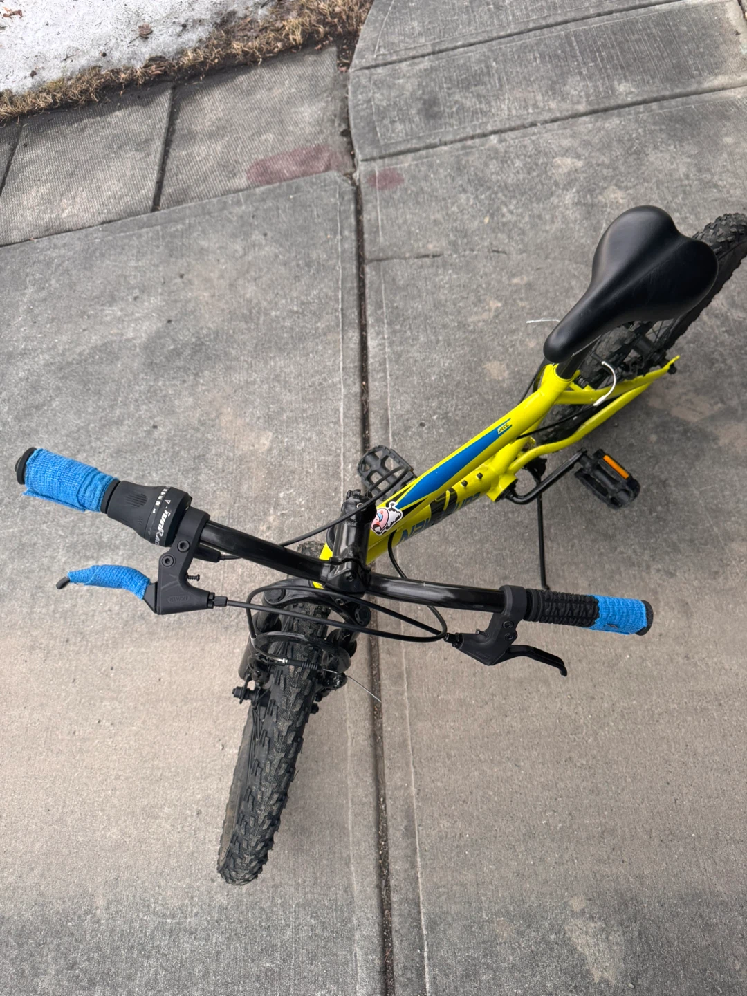 This is a yellow-green bike with handlebar grips and a black seat. It has front suspension and hand brakes.Tires in good condition.No damages.Comes with bike bell as well.It is perfect for young riders to hit the trails or the neighbourhood streets!