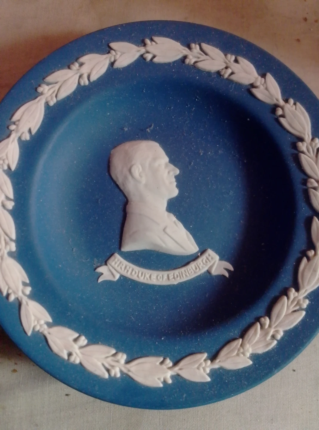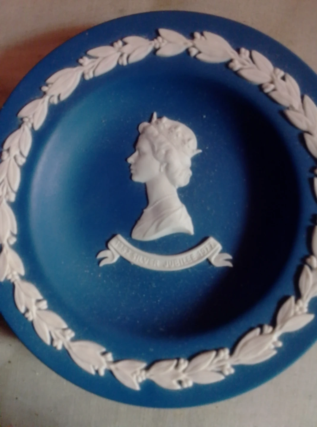 A stunning blue Jasperware plate celebrating the Queen Elizabeth II Silver Jubilee in 1977. It features a detailed relief of Her Majesty on one side and the Duke of Edinburgh on the other, surrounded by a classic laurel wreath pattern. A beautiful commemorative piece for collectors.