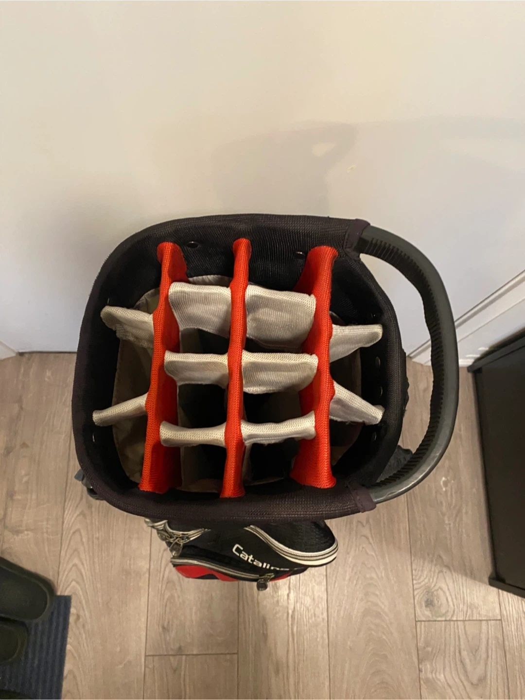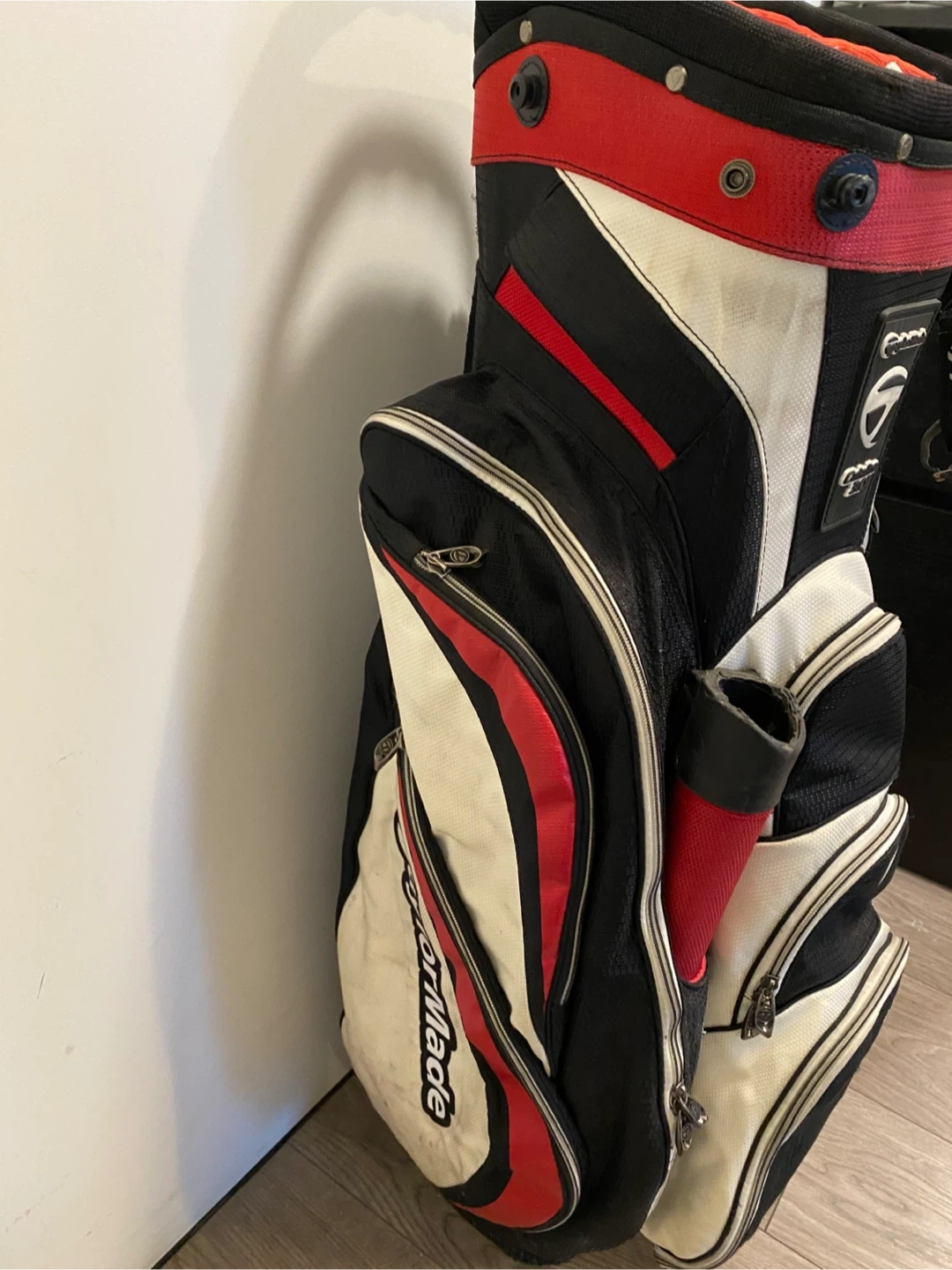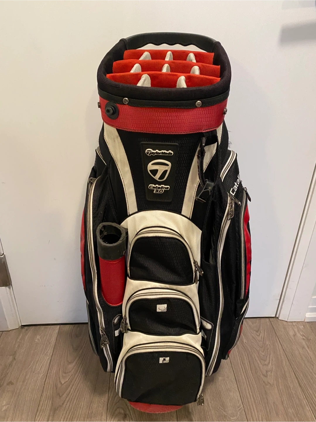 Looking to sell my TaylorMade Catalina 3.0 golf bag! It's in great shape and ready for the course. The bag features a sleek design with black, white, and red accents. Perfect for keeping your clubs organized and easily accessible!