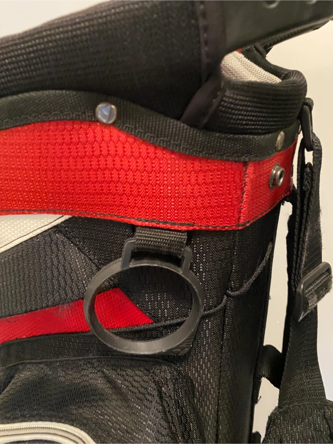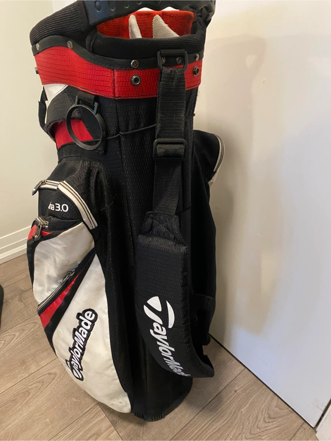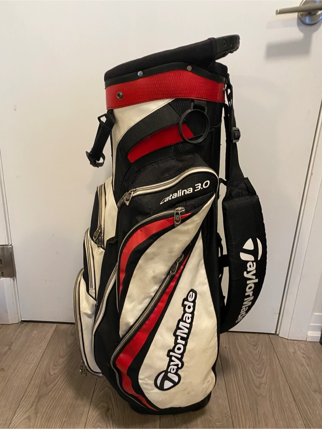Looking to sell my TaylorMade Catalina 3.0 golf bag! It's in great shape and ready for the course. The bag features a sleek design with black, white, and red accents. Perfect for keeping your clubs organized and easily accessible!