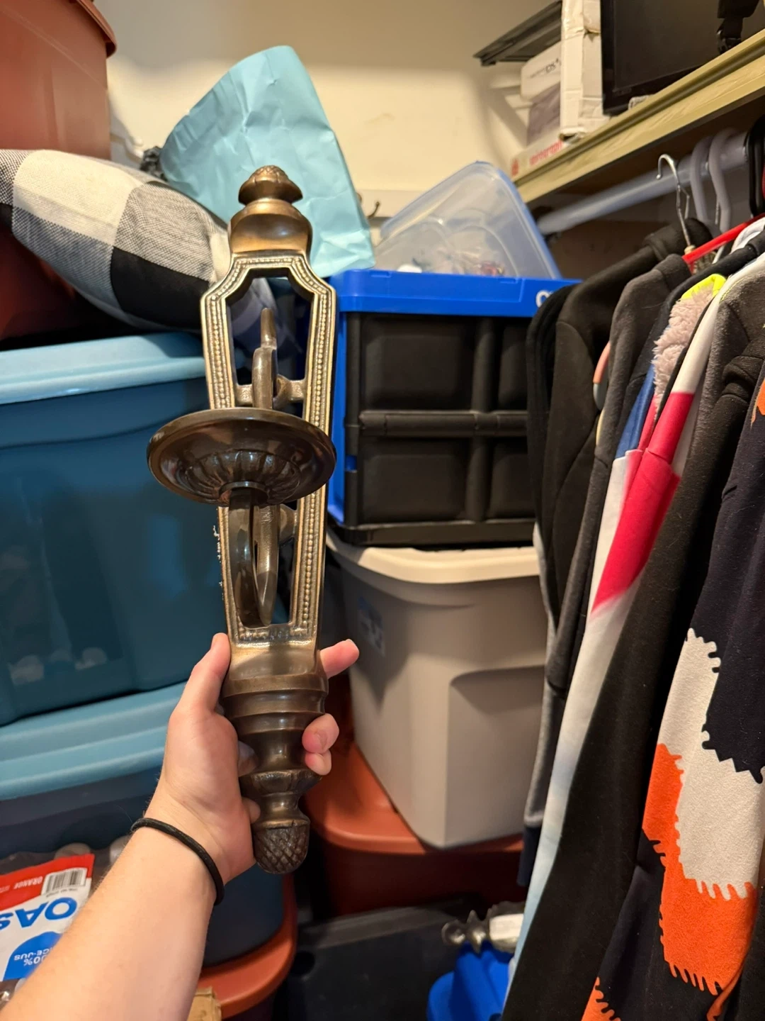This is a vintage metal sconce designed to hold a candle. It's made of brass-toned metal with an ornate, classic design. It has a detailed base and a holder for a single candle. This sconce would add a touch of old-world charm to any room.