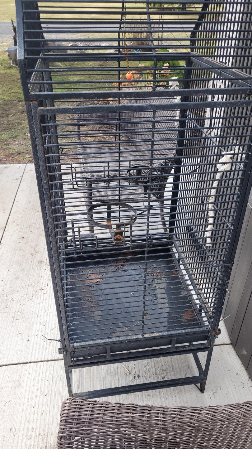 This is a large black bird cage with a pull-out tray for easy cleaning. It features a sturdy metal construction and a wire grate. Includes perches and a water dish. Could use a new coat of paint.