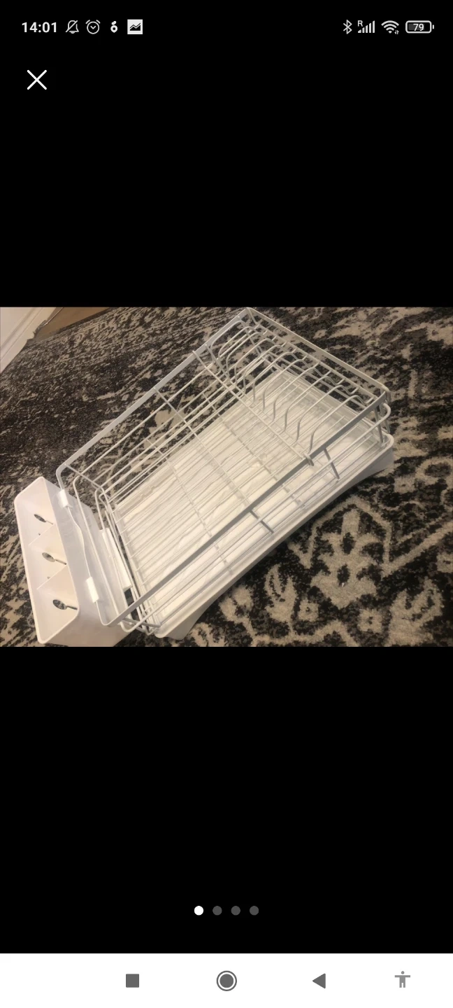 This is a white dish drying rack with a removable utensil holder. It's made of wire with a plastic drip tray and holder. It's designed to hold plates, bowls, and cutlery.