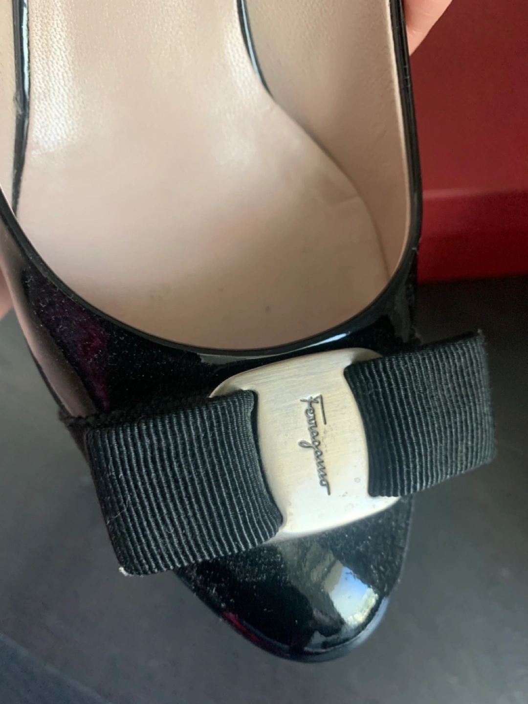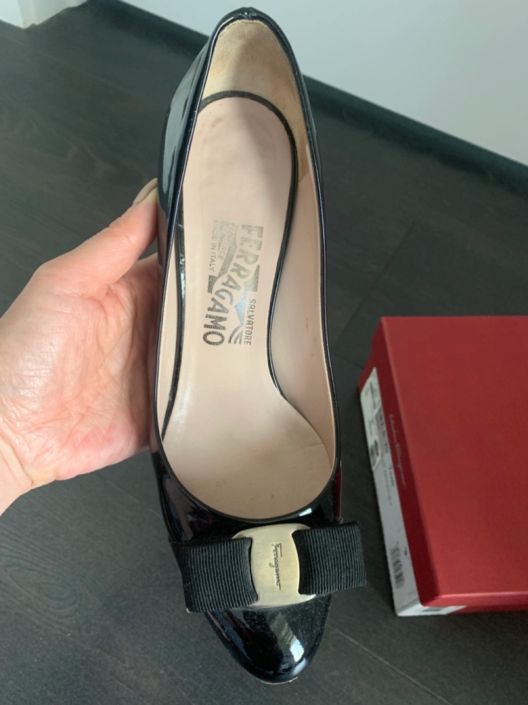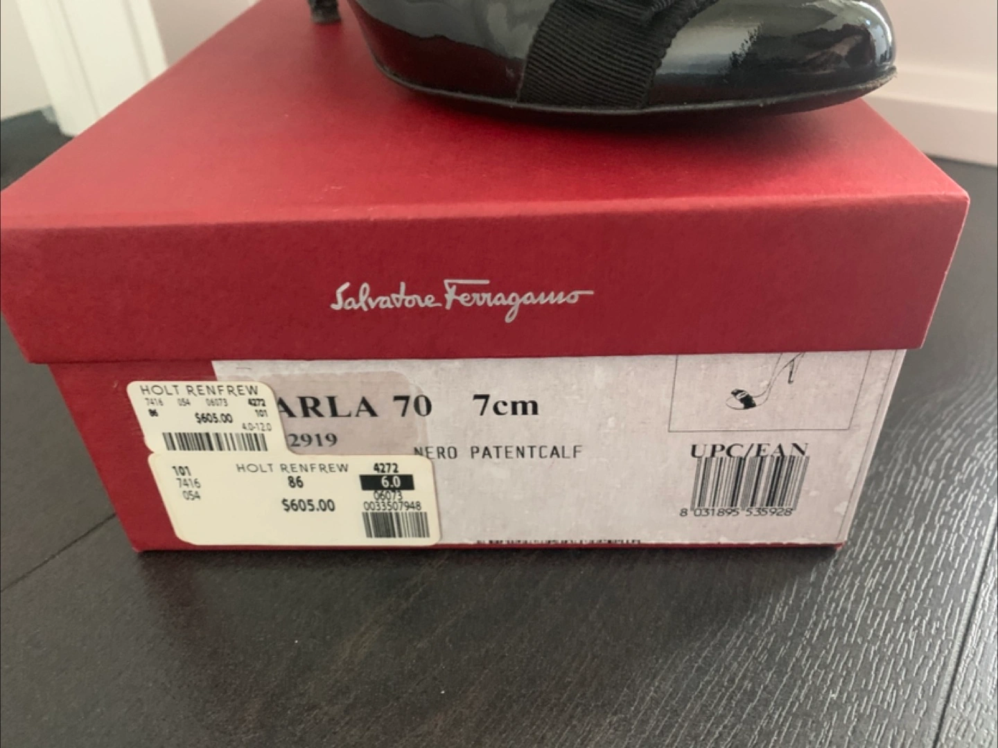 Selling a pair of Salvatore Ferragamo Arla 70 heels in black patent leather. They are a size 6. The original box is included! Originally bought for $605.00 at Holt Renfrew.