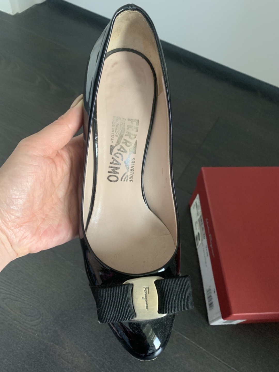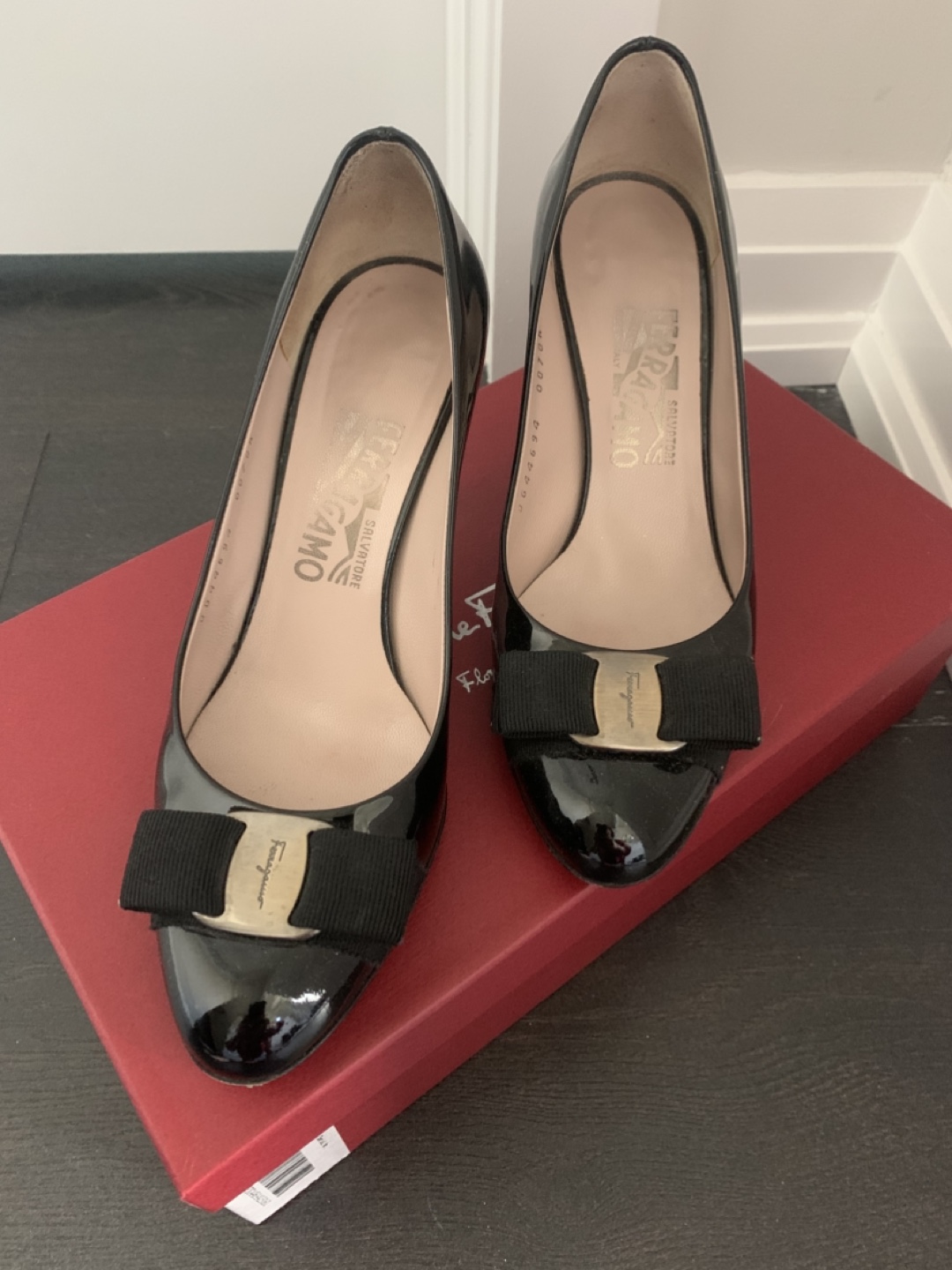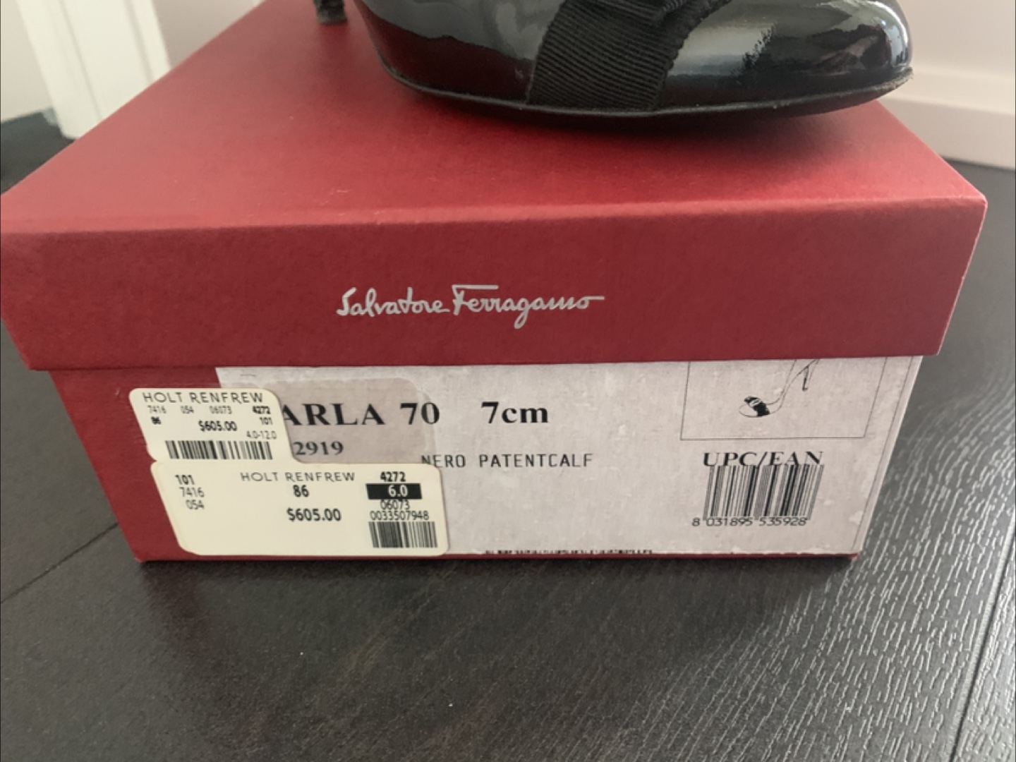 Selling a pair of Salvatore Ferragamo Arla 70 heels in black patent leather. They are a size 6. The original box is included! Originally bought for $605.00 at Holt Renfrew.