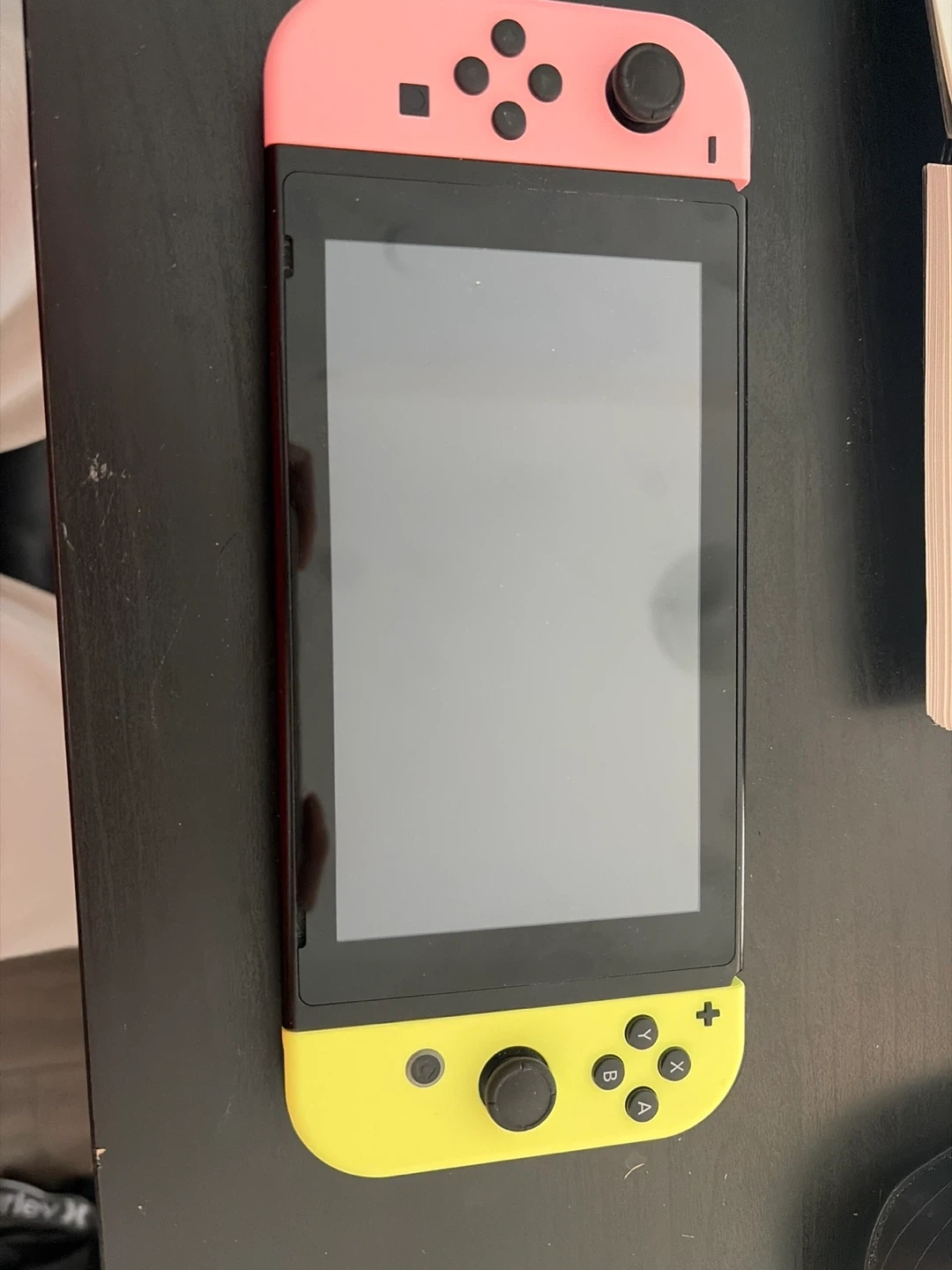 This is a Nintendo Switch console with pink and yellow Joy-Cons. It's a versatile gaming system that can be played in handheld, tabletop, or TV mode. It's great for gaming on the go or at home!