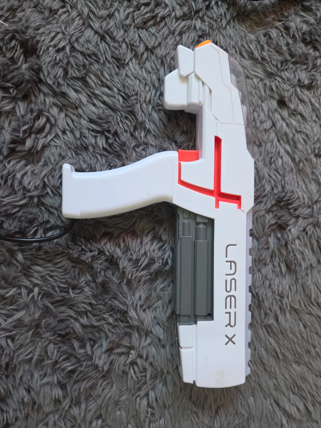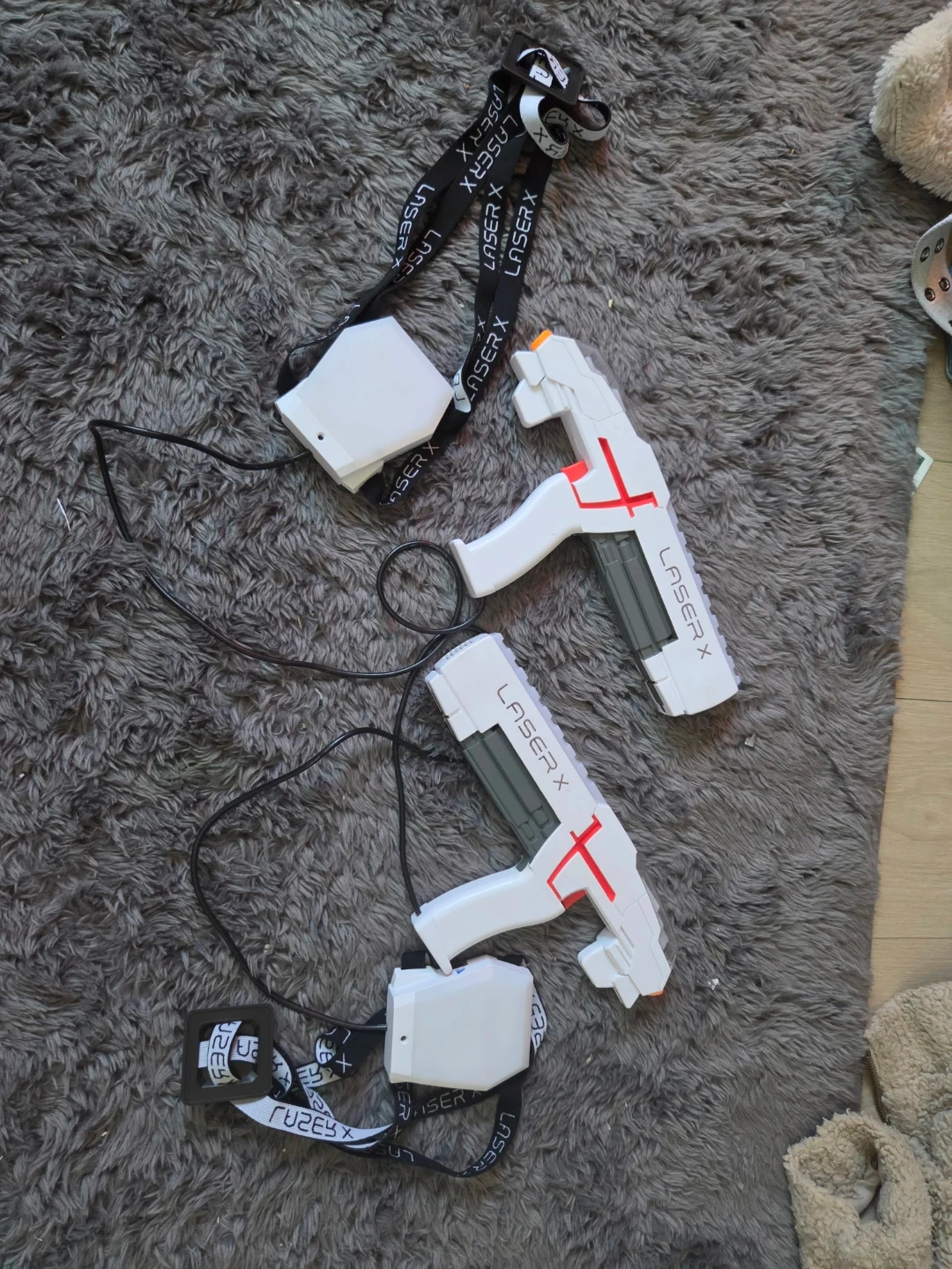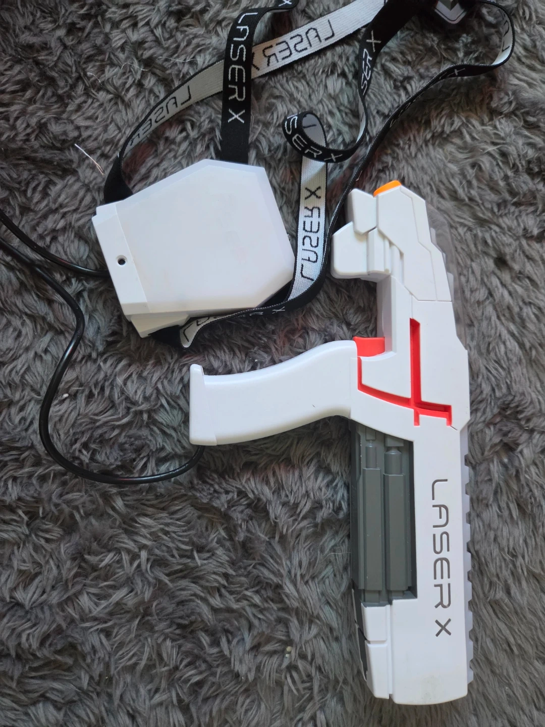 Two white Laser X electric lazer guns for in home Lazer battles.
