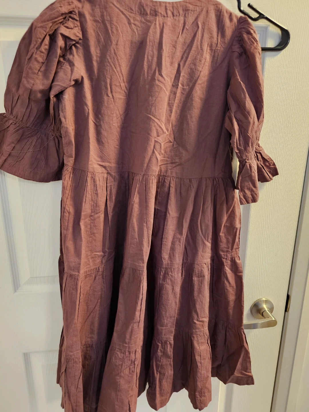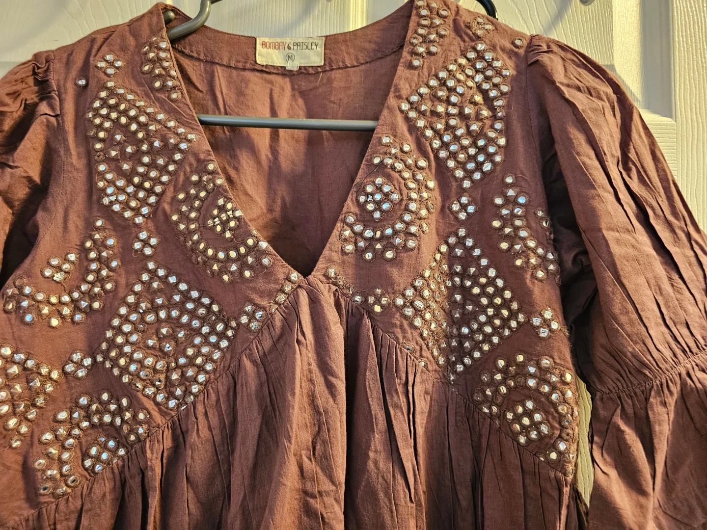 This Bombay & Paisley dress features a V-neck and embellished detailing on the bodice. It's a tiered style with ruffled sleeves. Made from a breathable cotton fabric