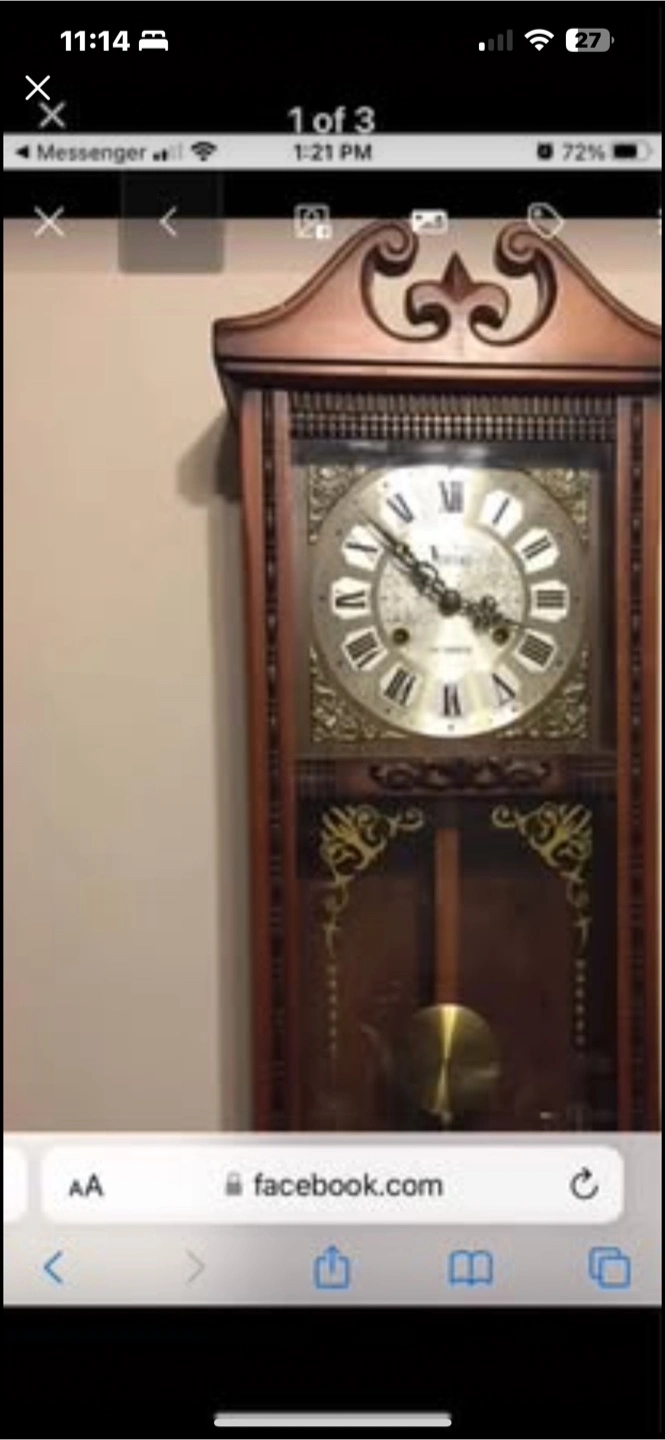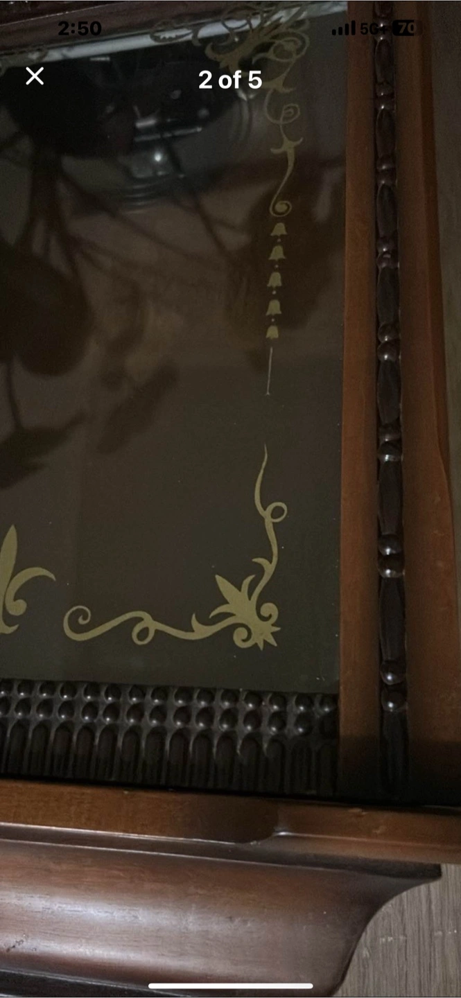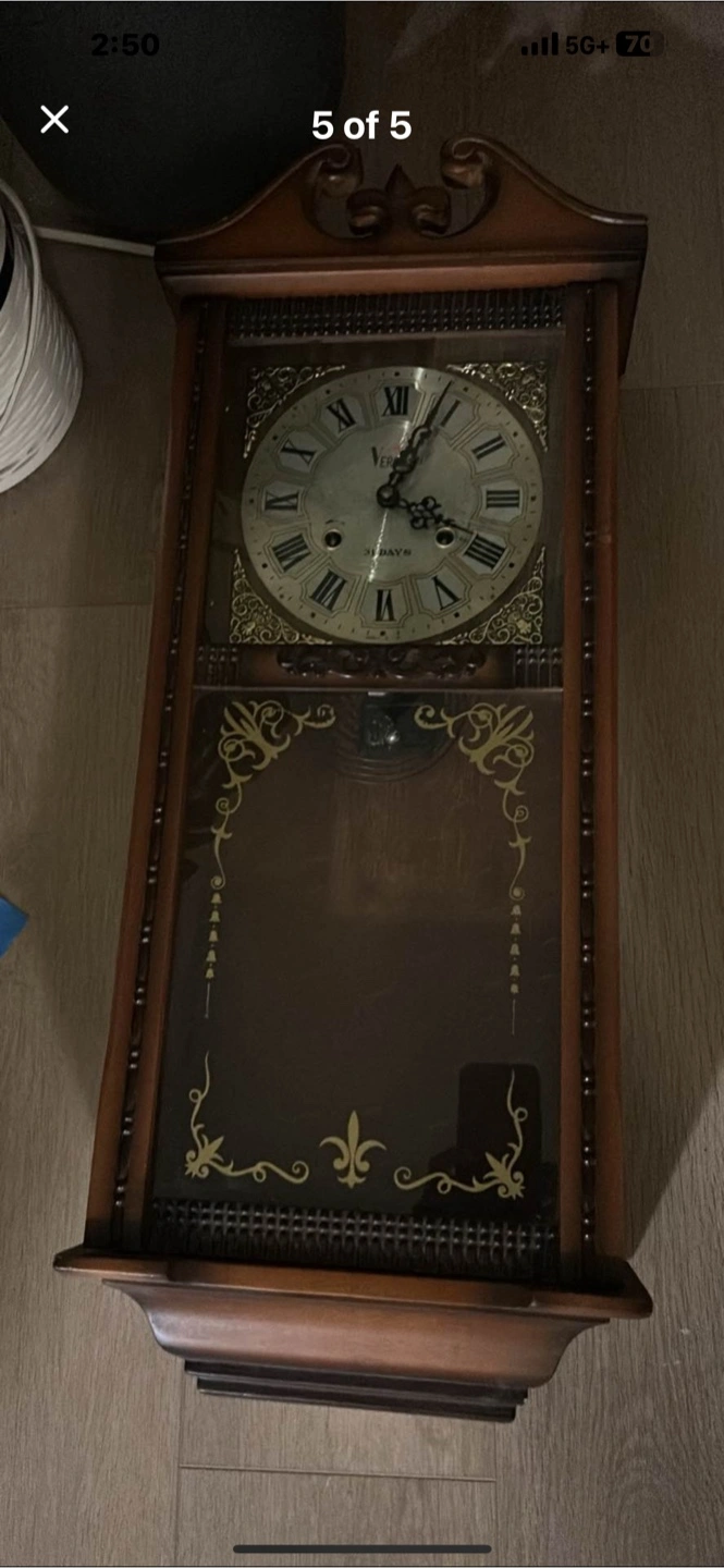 A beautiful antique Howard Miller wall clock with a pendulum. It's made of wood and features Roman numerals on the face. It's a classic piece for any home!