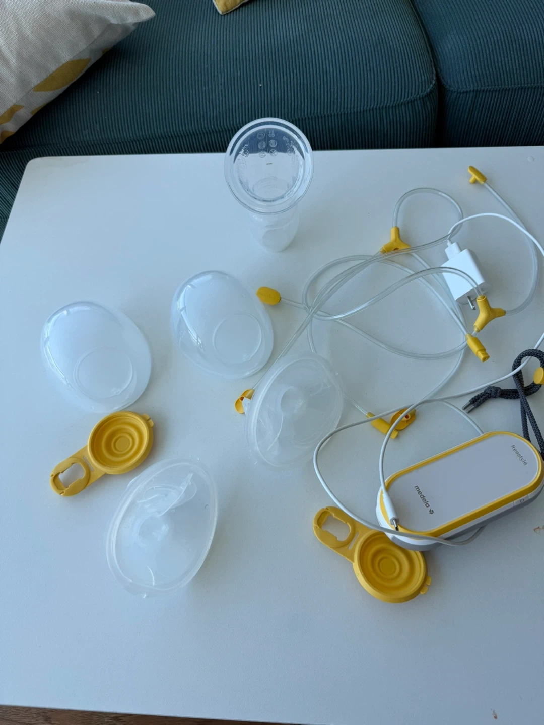 This is a Medela Freestyle double electric breast pump. It's a portable and convenient option for mothers. Includes the pump unit, tubing, flanges, and power adapter.