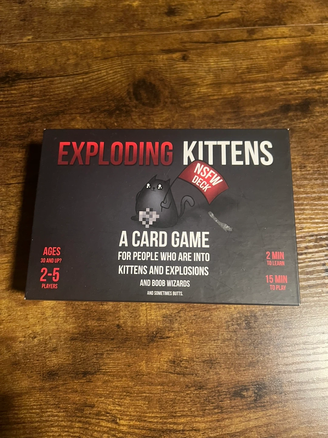 Exploding Kittens NSFW Deck card game for 2-5 players. Ages 30 and up. It takes 2 minutes to learn and 15 minutes to play. This game is for people who are into kittens and explosions, and boob wizards, and sometimes butts!