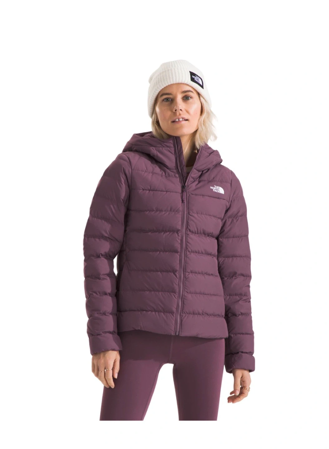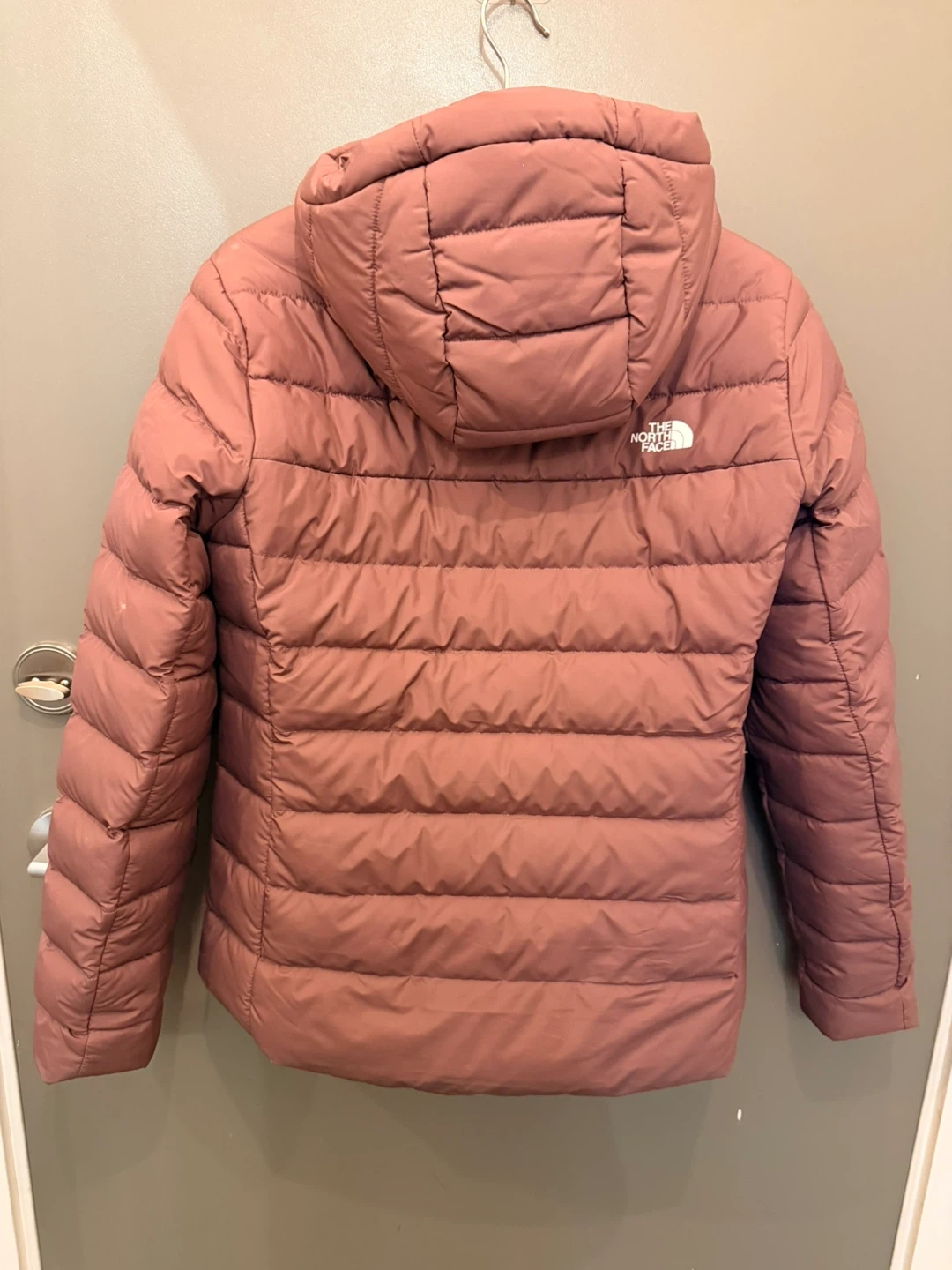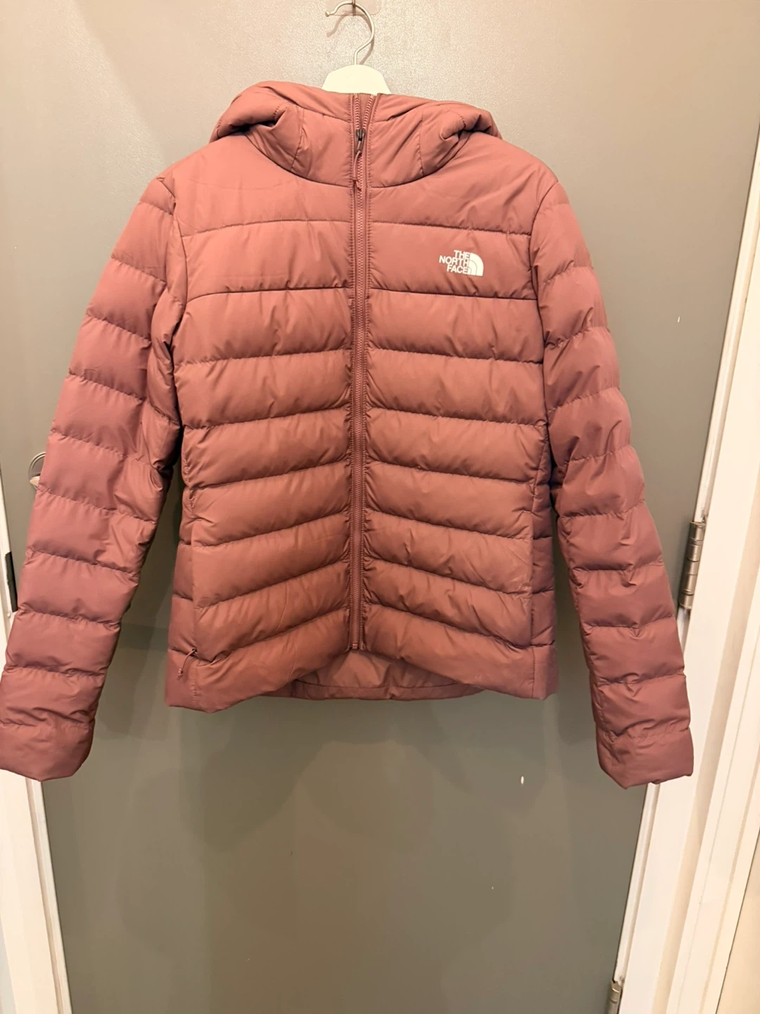 This is a plum-coloured hooded puffer jacket from The North Face. It's a lightweight and warm outer layer. The jacket is suitable for colder weather.