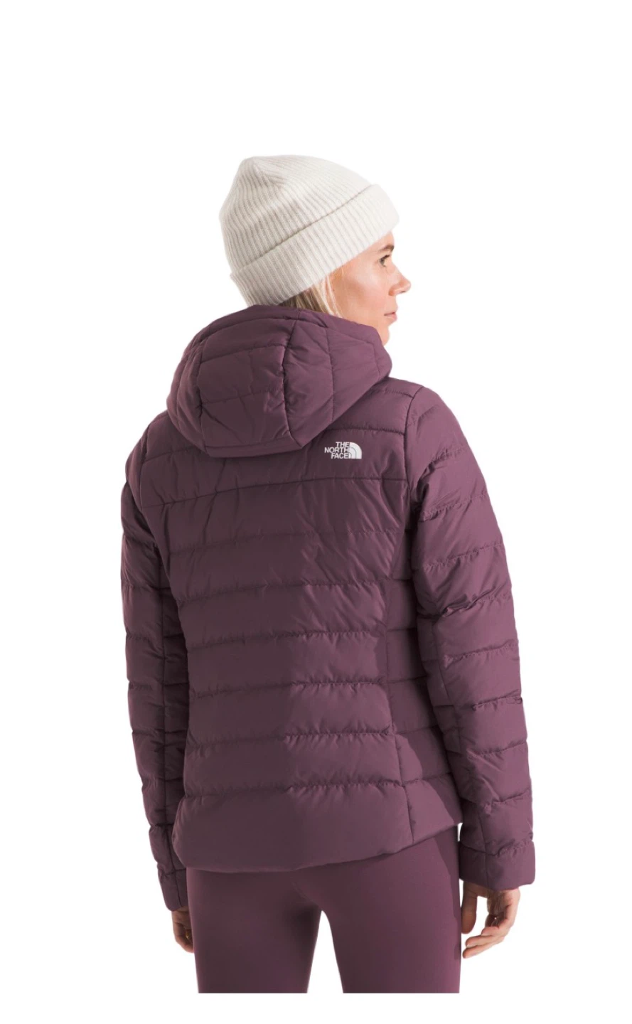 This is a plum-coloured hooded puffer jacket from The North Face. It's a lightweight and warm outer layer. The jacket is suitable for colder weather.