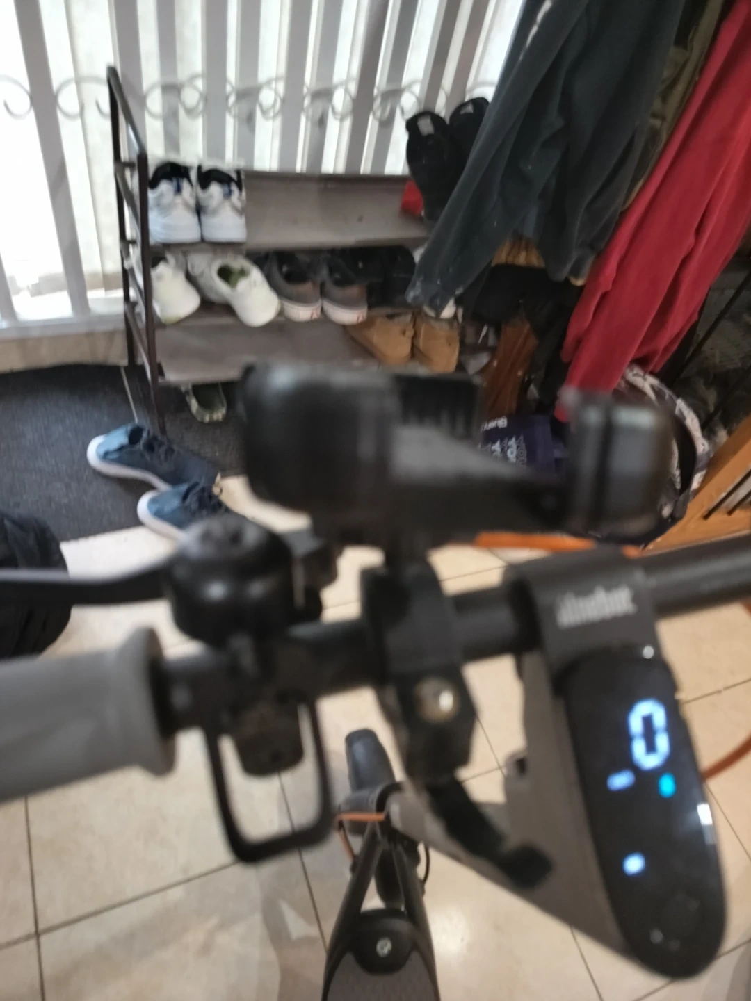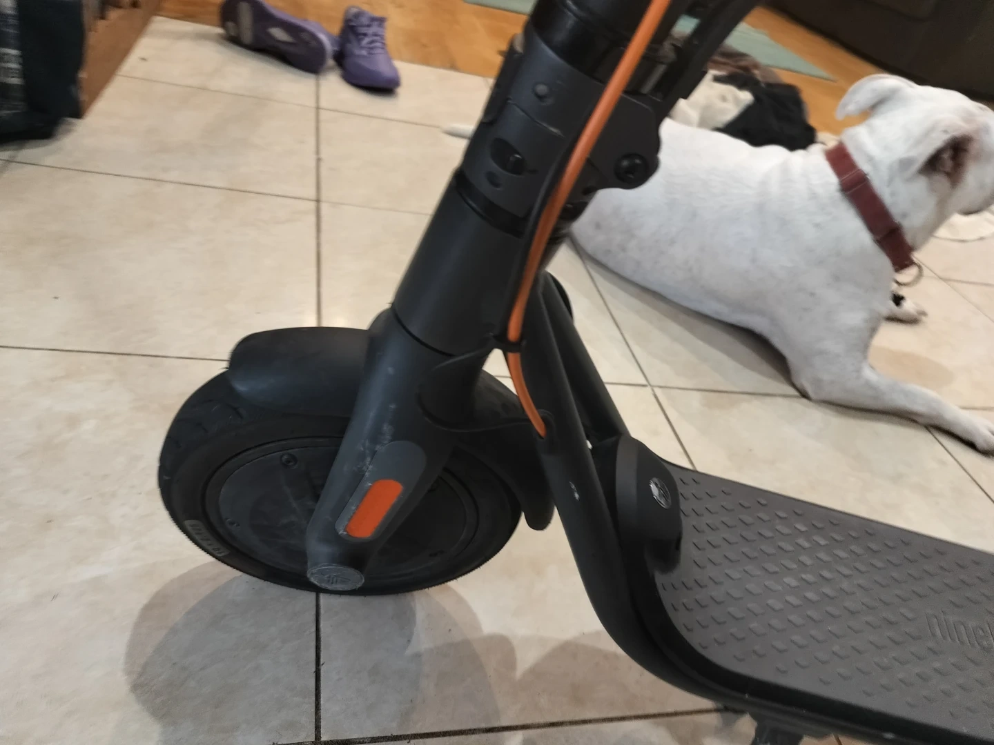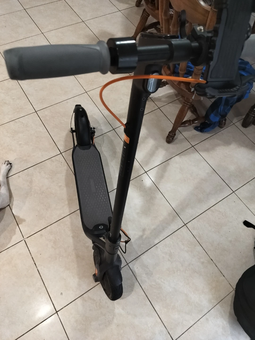This is a Ninebot electric scooter. It's black and grey with orange accents. It has a digital display on the handlebars.