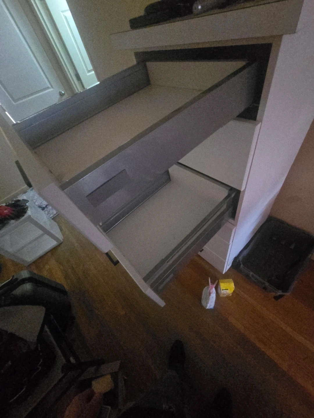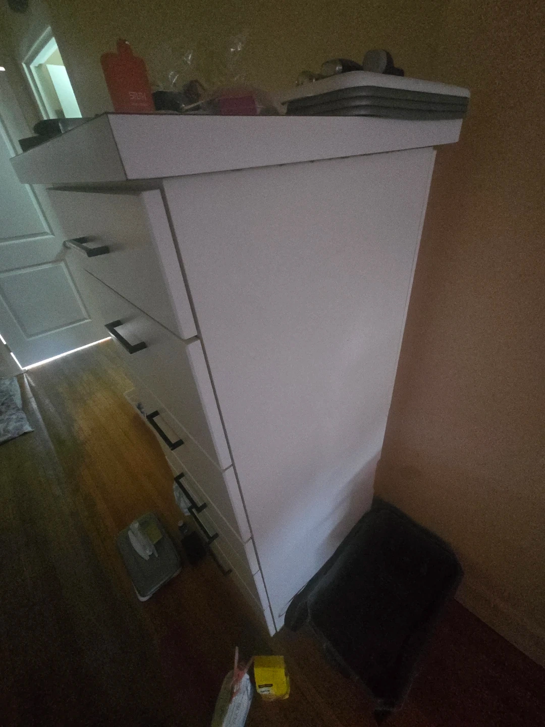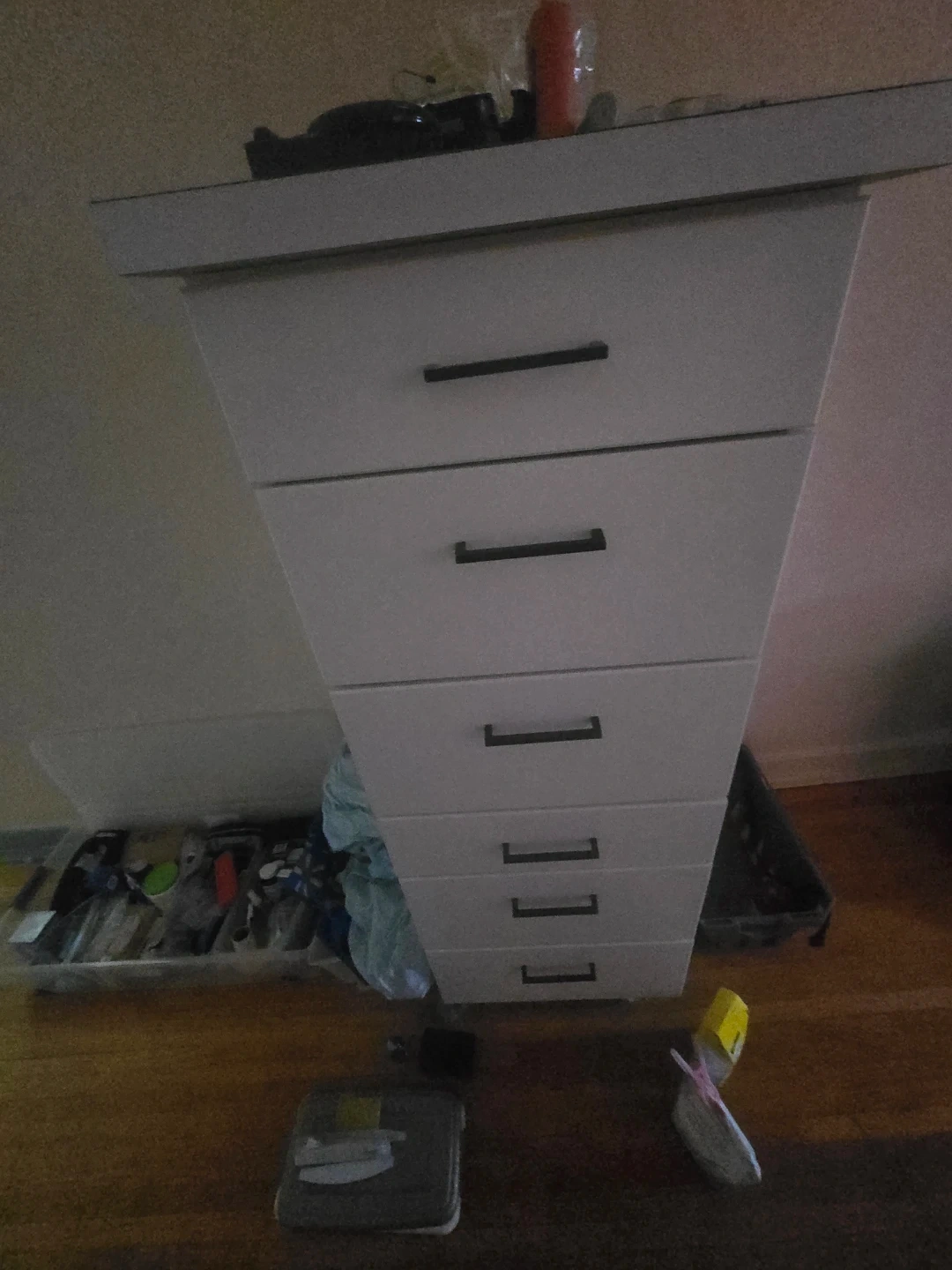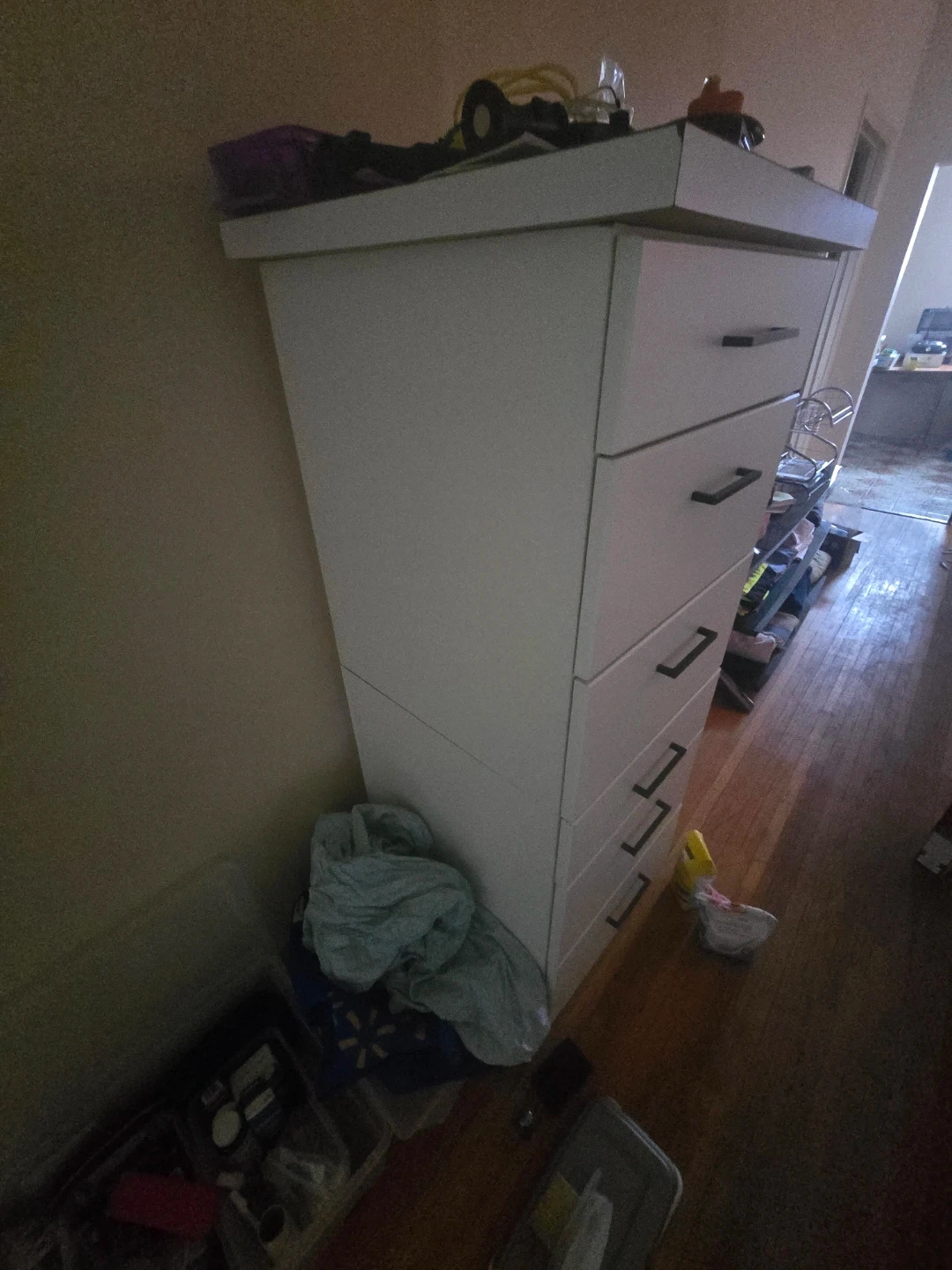 This is a white rolling dresser with seven drawers. It's constructed from durable materials and offers ample storage space. The sleek design complements most bedroom decors.