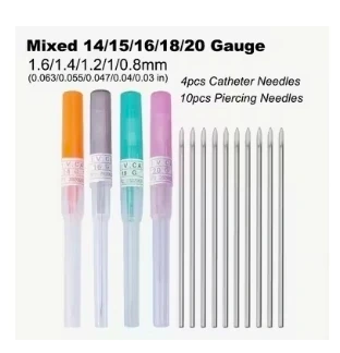 Set includes 4pcs catheter needles and 10pcs piercing needles. Available in mixed gauges: 14, 15, 16, 18, and 20. Metric sizes range from 1.6mm to 0.8mm.