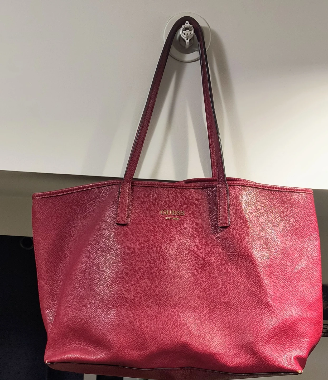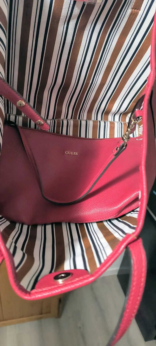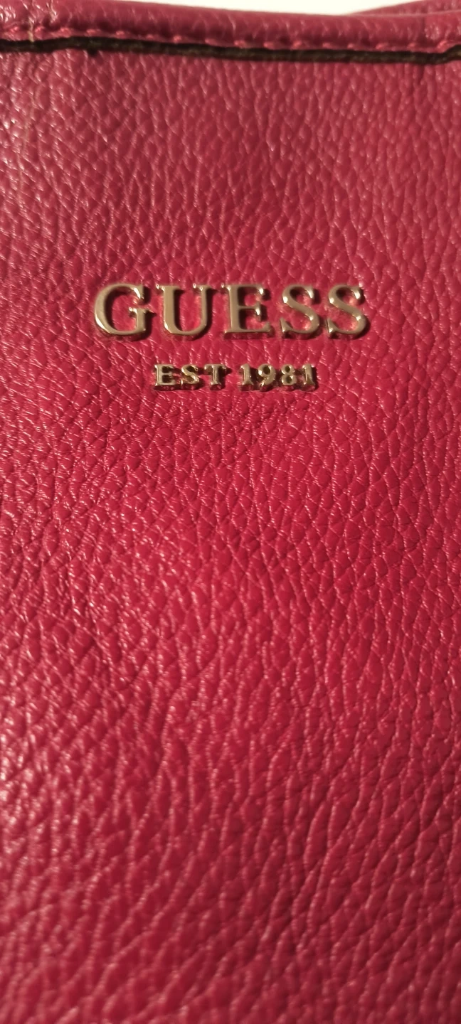 This is a Red Guess Deep Tote Bag. It is vegan leather, has a striped lining and comes with a matching smaller pouch (perfect for makeup/accessories). Great for everyday use!