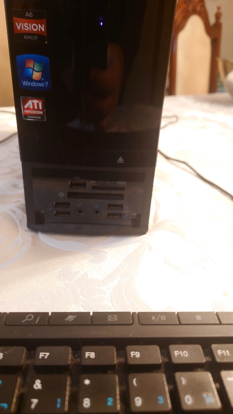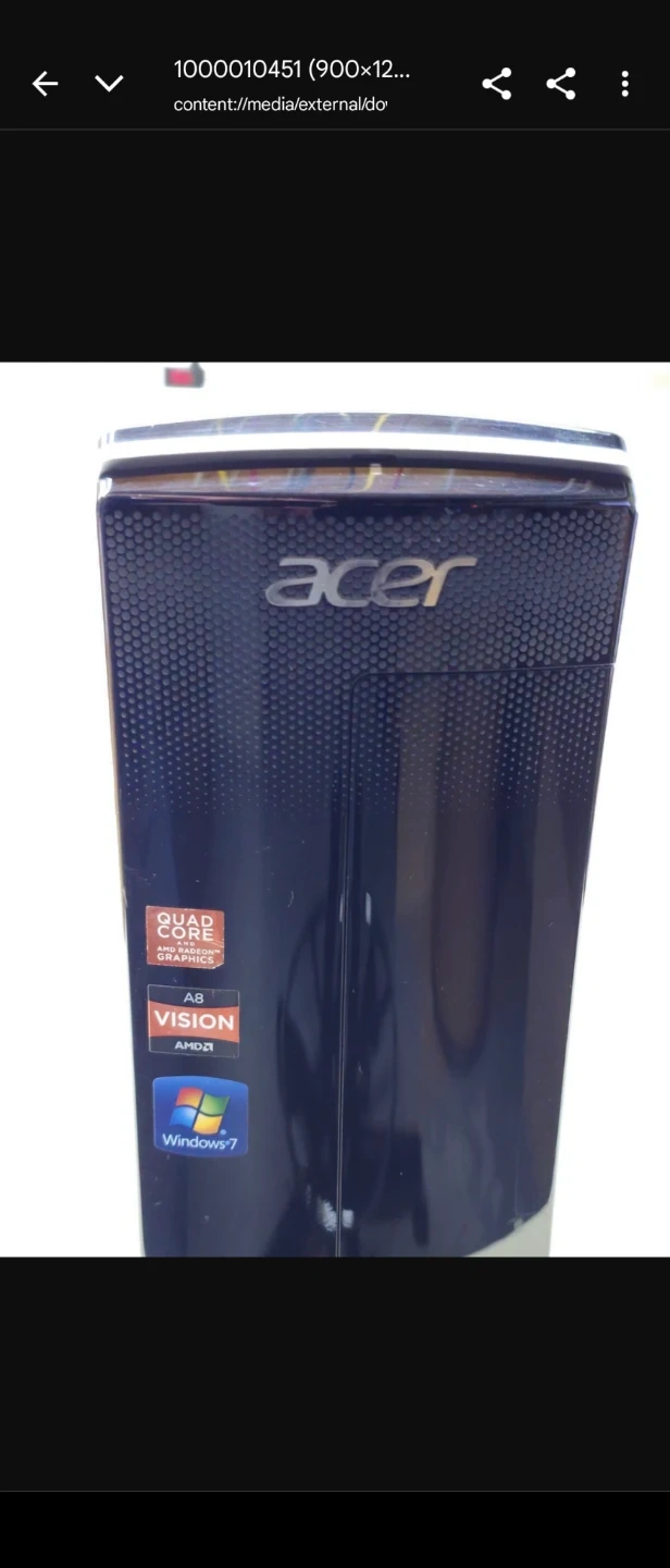 This is an Acer desktop computer tower. It comes with quad-core graphics and AMD A8 processor. Runs on Windows 7. Wired Set Keyboard Included