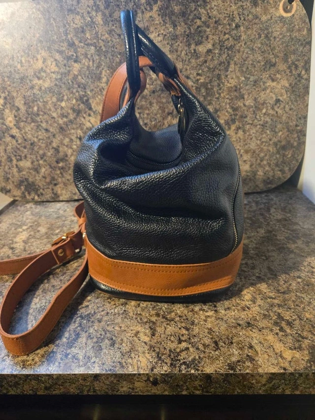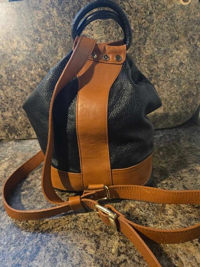 Stylish Valentina bag made from genuine Italian leather in black and tan. This versatile bag can be converted from a bucket bag to a backpack. Features gold-tone hardware with V logo details on the zippers and adjustable straps. Condition: Used - Good. Cash accepted.