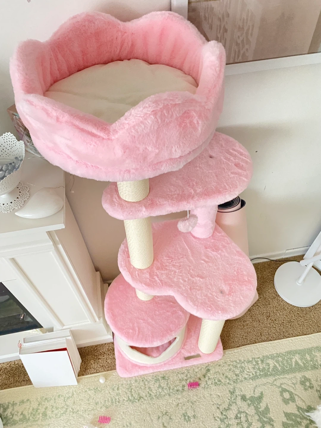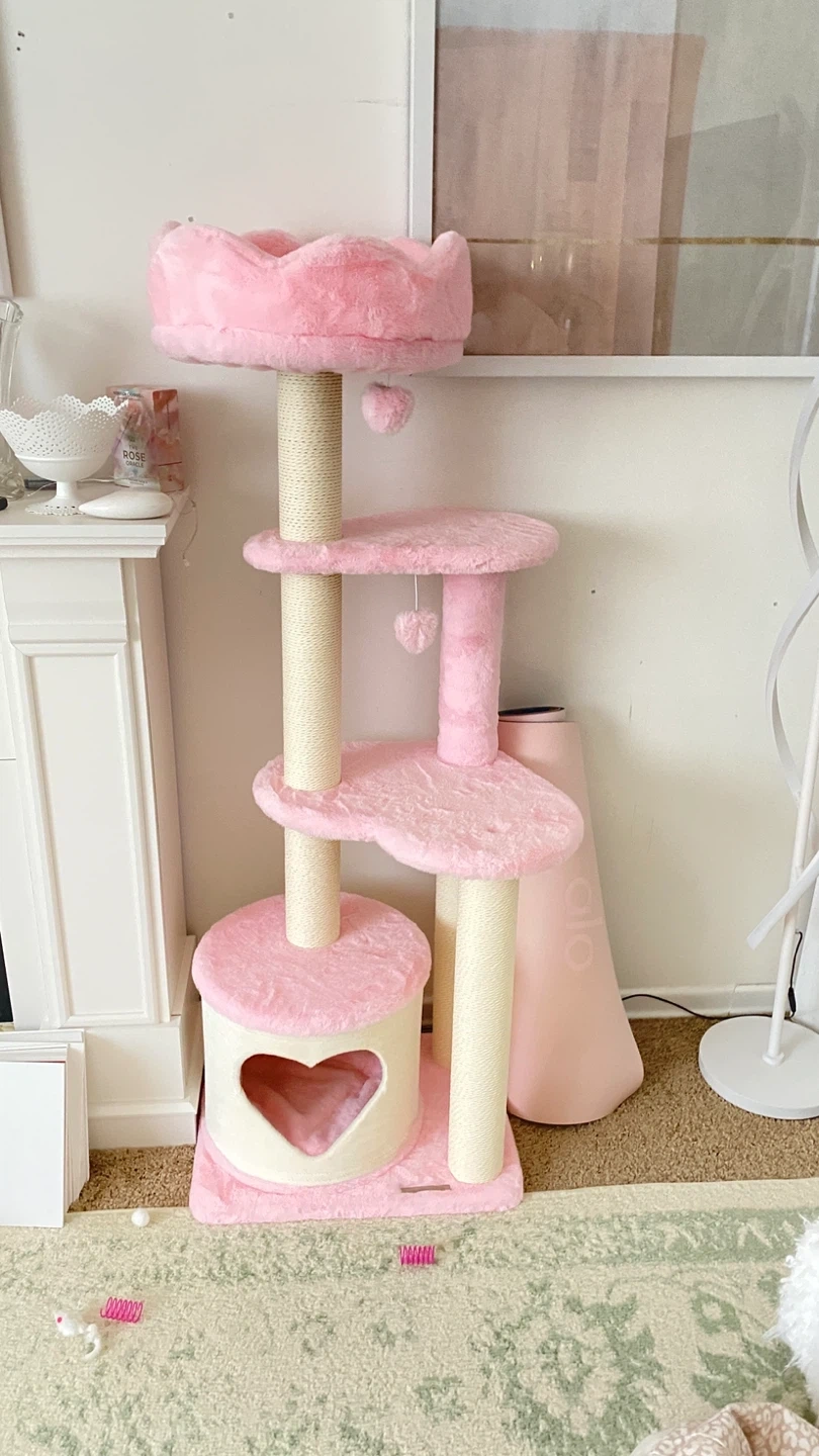 This multi-level cat tree features scratching posts covered in sisal rope. It has a cozy hideaway condo with a heart-shaped entrance and several platforms for lounging. The plush pink covering is soft and inviting for cats.