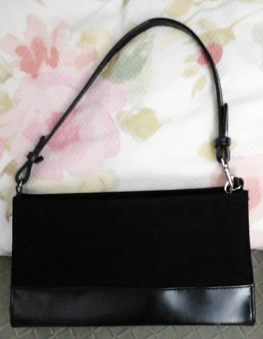 Little black shoulder bag, single snap closure and short strap. Upper part is fabric.