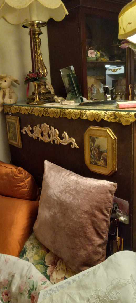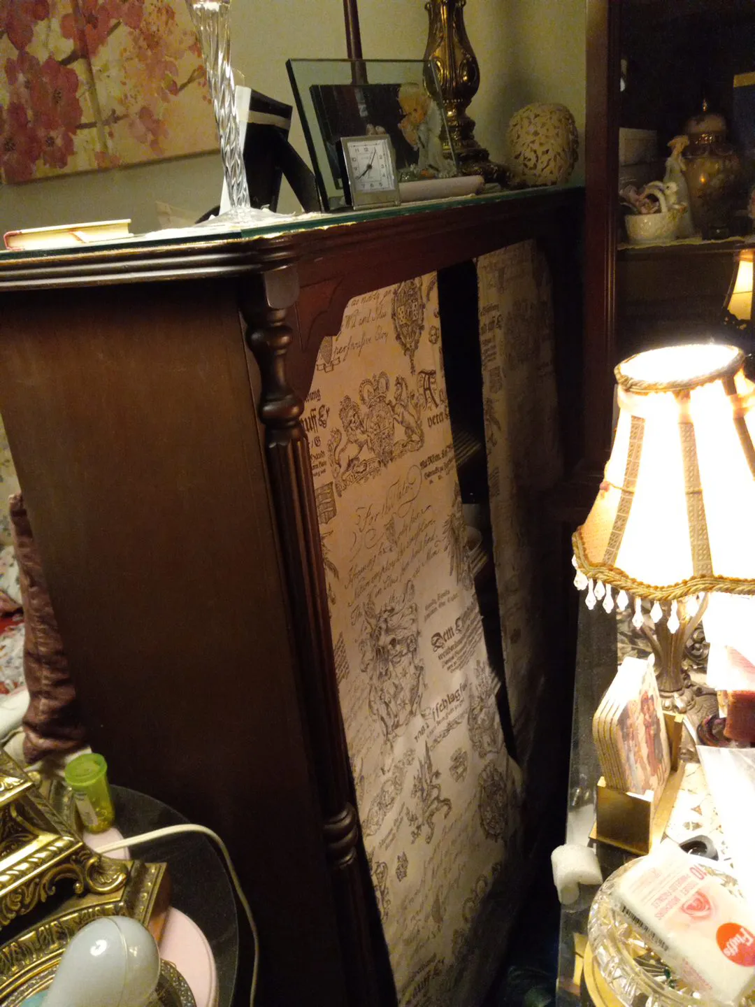 This Wonderful piece comes w lace and glass if they are wanted. Four lined shelves with lovely carved edging and vintage inspired half pillars, beautifully turned milllwork in solid walnut, a warm dark wood, indicative of the richness of wood cabinetry used in the turn of the last century. hand made curtains are also available.