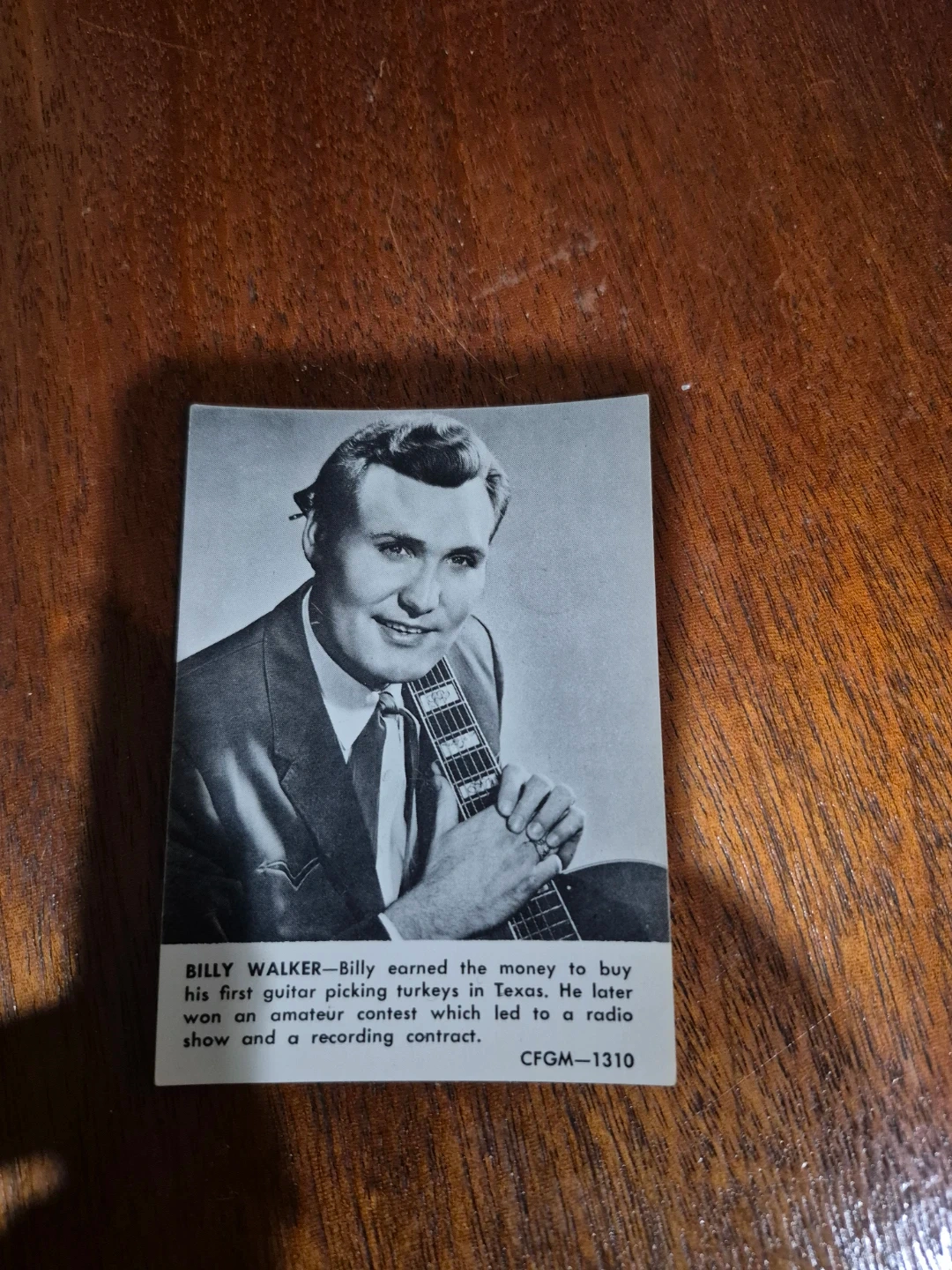 This is a photo card featuring Billy Walker. It details his journey of earning money to buy his first guitar and later winning an amateur contest that led to a radio show and recording contract. The item is identified with the code CFGM-1310.