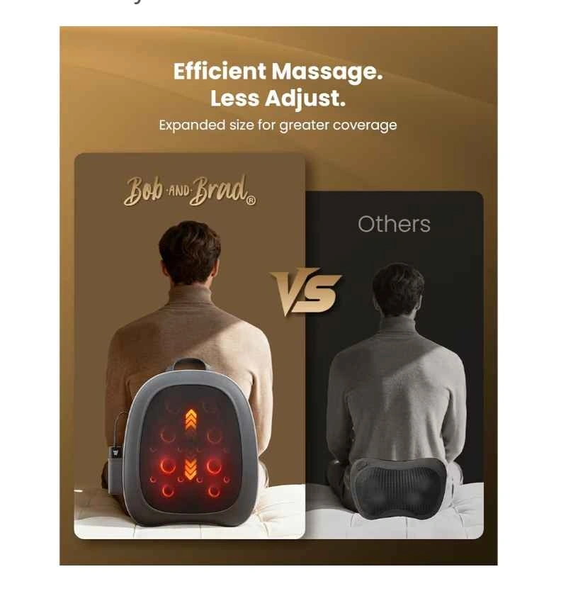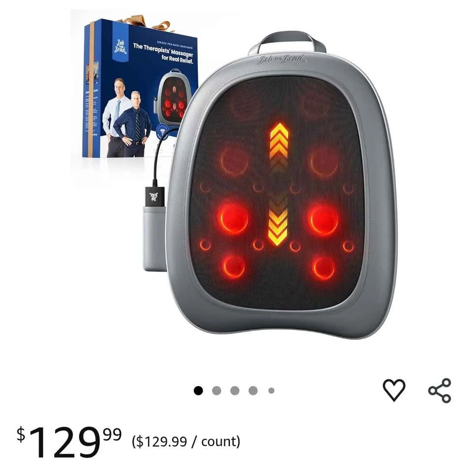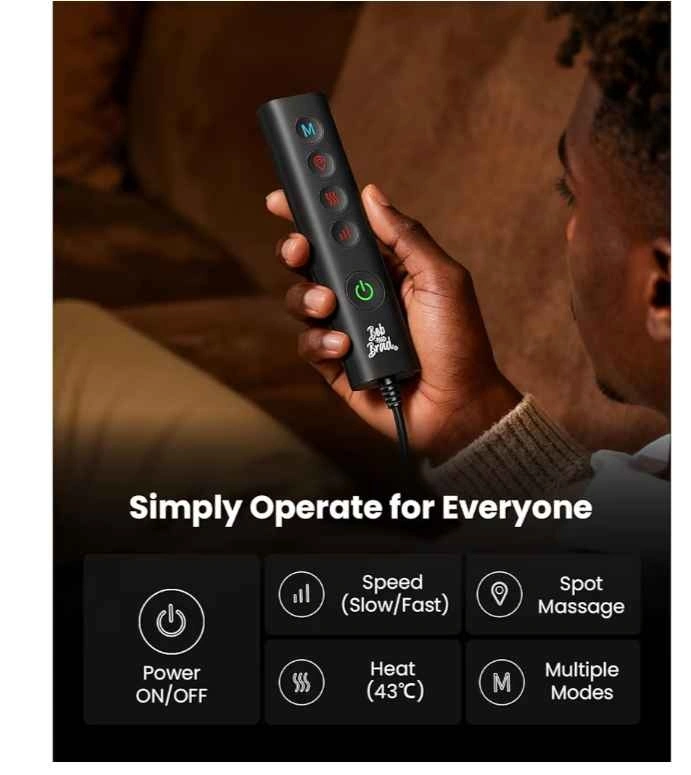 Relaxing Bob and Brad back massager. Has heat function for extra comfort. Comes with remote control for easy adjustments. Multiple massage modes and adjustable speed. Gives good coverage for your back.