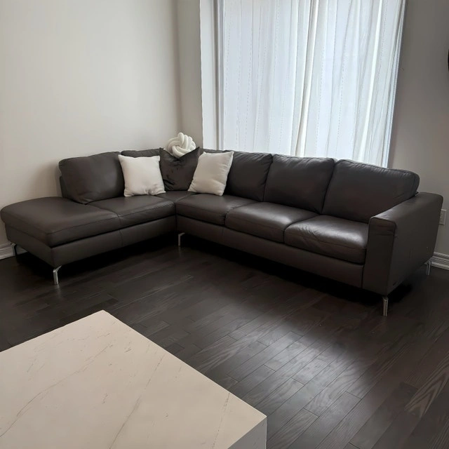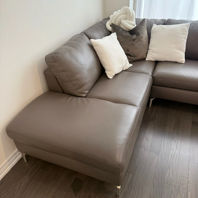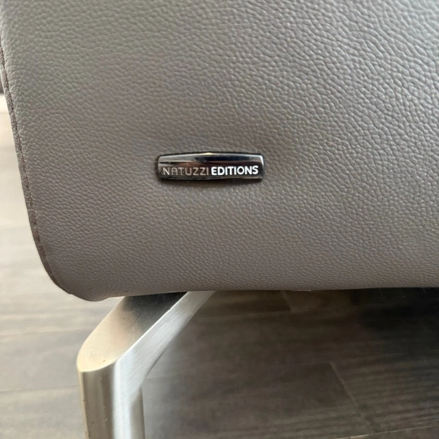 Beautiful Natuzzi Editions genuine leather sectional. Originally paid $4,000. In 9/10 condition — very well maintained. Modern taupe/grey tone with sleek metal legs. Clean lines, low profile, and extremely comfortable. Approx. Dimensions: • 114” length • 35” depth • 83” chaise • 30” height. The chaise is long and perfect for fully stretching out. No rips, no sagging, no damage. From a smoke-free home. High-end Italian brand quality at a fraction of retail. Located in Aurora.