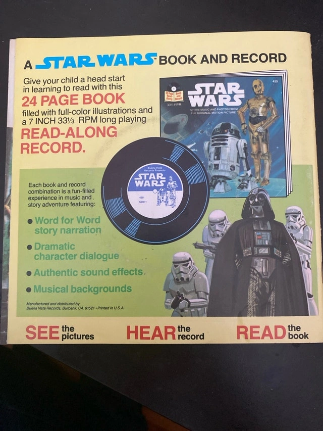 Relive the magic of the original Star Wars motion picture with this vintage 1979 book and record set, featuring story, music, and photos. While the item has been enjoyed, it remains in good condition for its age. Feel the Force with this nostalgic piece! If you see this ad, the book and record are still available, ready to transport you to a galaxy far, far away.