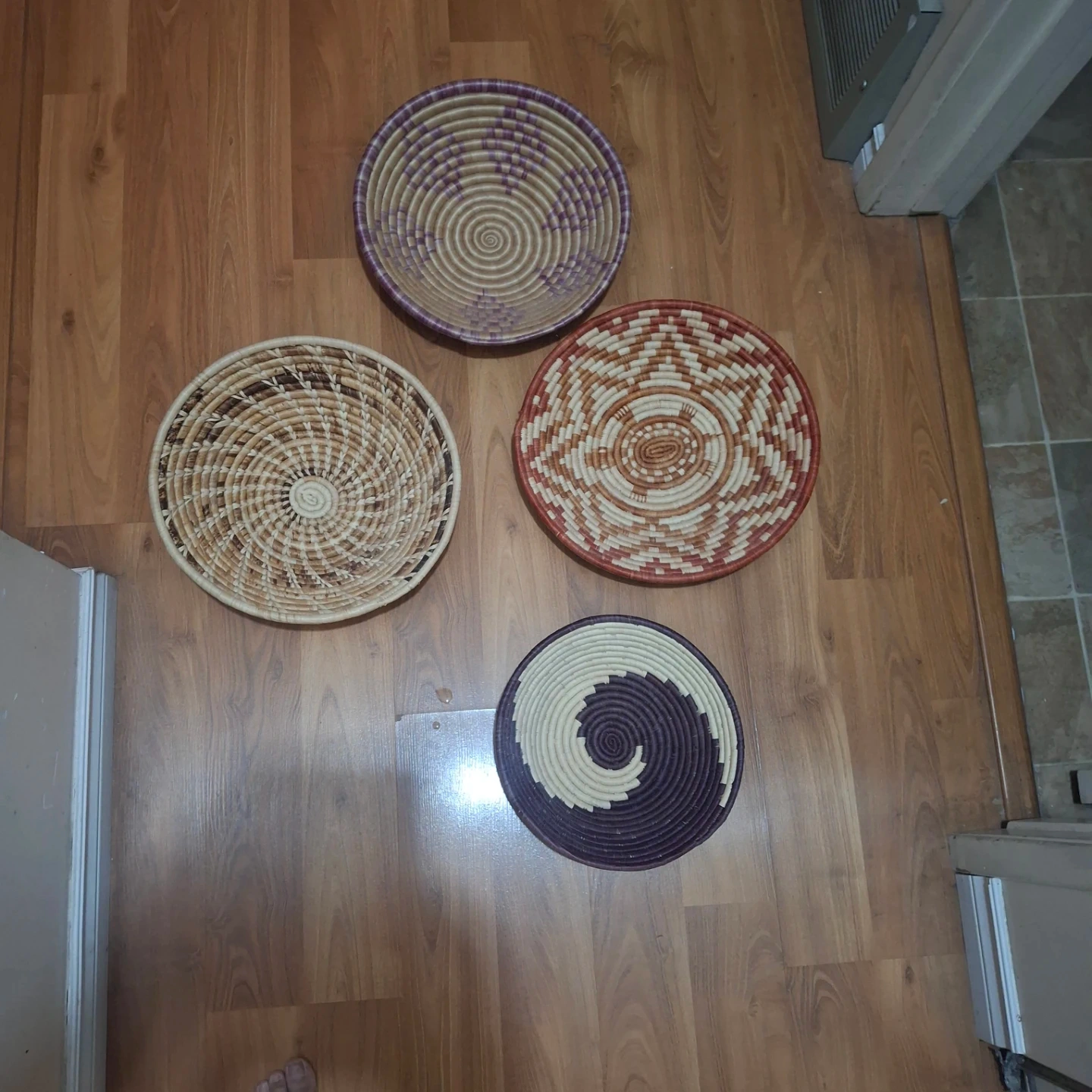 A set of four decorative woven baskets. Each basket features a unique pattern and colour combination. They're great for organizing small items or as unique wall decor! Made in zimbabwe