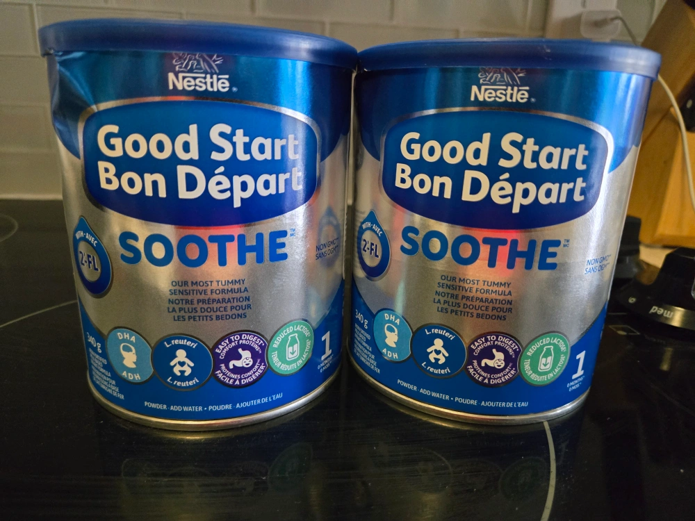 Two cans of Nestle Good Start Soothe infant formula. Gentle on sensitive tummies. Reduced lactose. Stage 1.