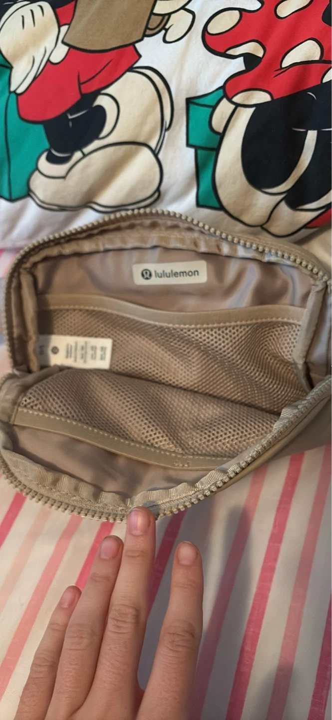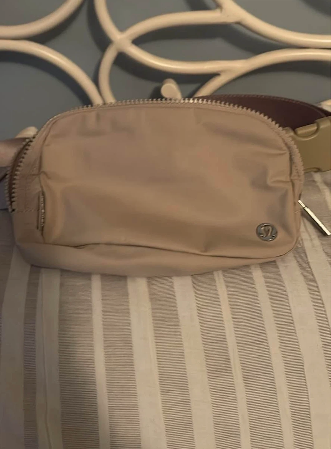 This Lululemon Everywhere Belt Bag is beige. It's a convenient size for essentials. It has multiple pockets inside for organization.
