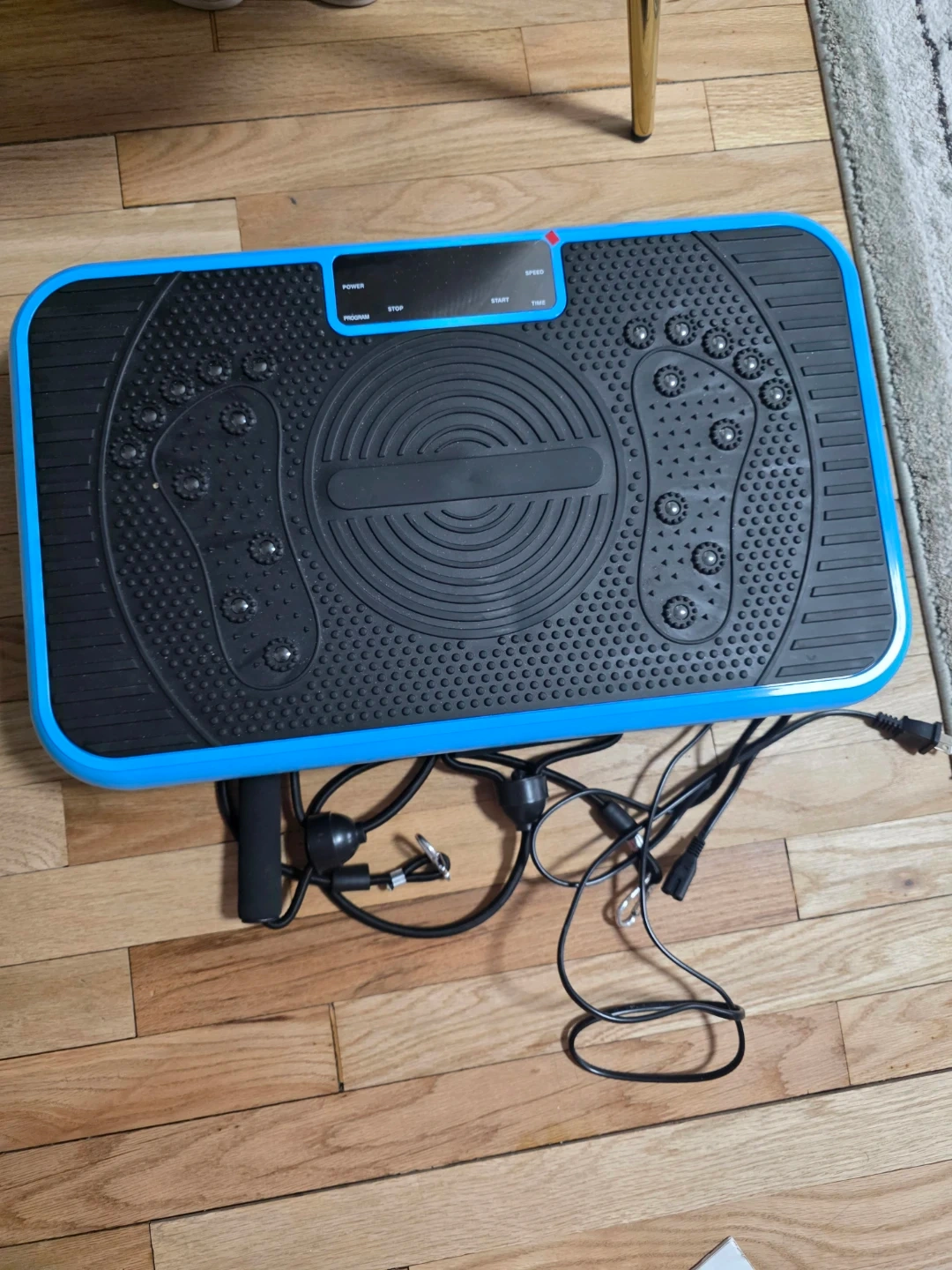 This is a vibration platform exercise machine in blue. It has controls for power, program, speed, start, stop, and time. Includes resistance bands for a full-body workout. Offers a unique massage surface for feet.